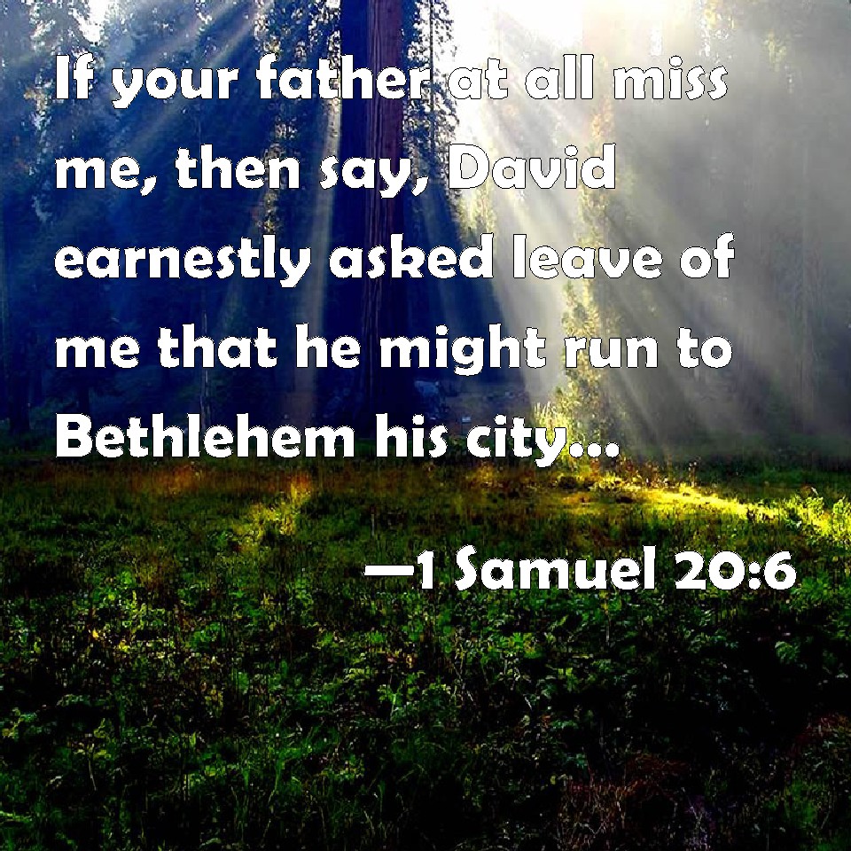 Choose a Background 1 Samuel 20:6 If your father at all miss me, then say, David earnestly asked leave of me that he might run to Bethlehem his city: for there is a yearly sacrifice there for all the family. KJV: If thy father at all miss me, then say, David earnestly asked leave of me that he might run to Bethlehem his city: for there is a yearly sacrifice there for all the family. DRB: If thy father look and inquire for me, thou shalt answer him: David asked me that he might run to Bethlehem his own city: because there are solemn sacrifices there for all his tribe. DBT: If thy father should actually miss me, then say, David earnestly asked leave of me that he might run to Bethlehem his city; for there is a yearly sacrifice there for all the family. ERV: If thy father miss me at all, then say, David earnestly asked leave of me that he might run to Beth-lehem his city: for it is the yearly sacrifice there for all the family. WBT: If thy father shall at all miss me, then say, David earnestly asked leave of me, that he might run to Beth-lehem his city: for there is a yearly sacrifice there for all the family. WEB: If your father miss me at all, then say, 'David earnestly asked leave of me that he might run to Bethlehem his city; for it is the yearly sacrifice there for all the family.' YLT: if thy father at all look after me, and thou hast said, David asked earnestly of me to run to Beth-Lehem his city, for a sacrifice of the days is there for all the family.Links 1 Samuel 20:6 NIV • 1 Samuel 20:6 NLT • 1 Samuel 20:6 ESV • 1 Samuel 20:6 NASB • 1 Samuel 20:6 KJV • 1 Samuel 20:6 Interlinear • 1 Samuel 20:6 Commentaries • 1 Samuel 20:6 Parallel Texts • 1 Samuel 20:6 Bible Apps • 1 Samuel 20:6 Parallel • Bible Hub |