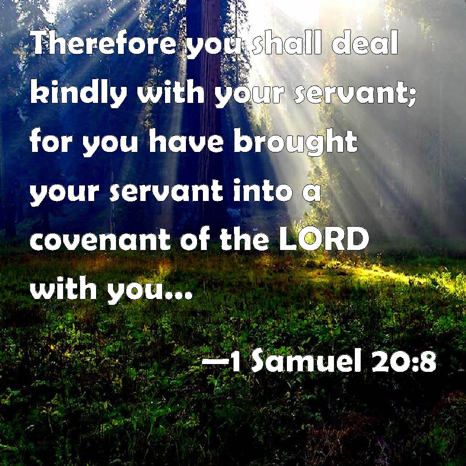 Choose a Background 1 Samuel 20:8 Therefore you shall deal kindly with your servant; for you have brought your servant into a covenant of the LORD with you: notwithstanding, if there be in me iniquity, slay me yourself; for why should you bring me to your father? KJV: Therefore thou shalt deal kindly with thy servant; for thou hast brought thy servant into a covenant of the LORD with thee: notwithstanding, if there be in me iniquity, slay me thyself; for why shouldest thou bring me to thy father? DRB: Deal mercifully then with thy servant: for thou hast brought me thy servant into a covenant of the Lord with thee. But if there be any iniquity in me, do thou kill me, and bring me not in to thy father. DBT: Deal kindly then with thy servant; for thou hast brought thy servant into a covenant of Jehovah with thee; but if there be in me iniquity, slay me thyself; for why shouldest thou bring me to thy father? ERV: Therefore deal kindly with thy servant; for thou hast brought thy servant into a covenant of the LORD with thee: but if there be in me iniquity, slay me thyself; for why shouldest thou bring me to thy father? WBT: Therefore thou shalt deal kindly with thy servant; for thou hast brought thy servant into a covenant of the LORD with thee: notwithstanding, if there is in me iniquity, slay me thyself; for why shouldst thou bring me to thy father? WEB: Therefore deal kindly with your servant; for you have brought your servant into a covenant of Yahweh with you: but if there be in me iniquity, kill me yourself; for why should you bring me to your father?" YLT: and thou hast done kindness, to thy servant, for into a covenant of Jehovah thou hast brought thy servant with thee; — and if there is in me iniquity, put thou me to death; and unto thy father, why is this — thou dost bring me in?'Links 1 Samuel 20:8 NIV • 1 Samuel 20:8 NLT • 1 Samuel 20:8 ESV • 1 Samuel 20:8 NASB • 1 Samuel 20:8 KJV • 1 Samuel 20:8 Interlinear • 1 Samuel 20:8 Commentaries • 1 Samuel 20:8 Parallel Texts • 1 Samuel 20:8 Bible Apps • 1 Samuel 20:8 Parallel • Bible Hub |