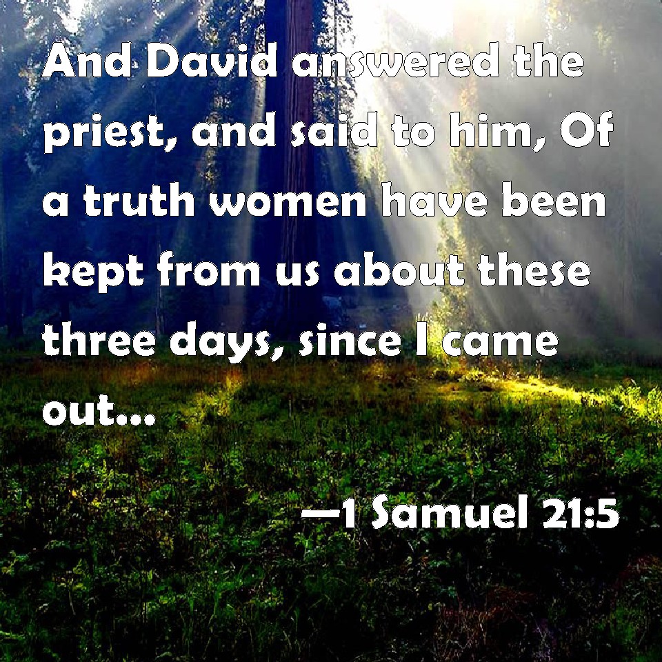 Choose a Background 1 Samuel 21:5 And David answered the priest, and said to him, Of a truth women have been kept from us about these three days, since I came out, and the vessels of the young men are holy, and the bread is in a manner common, yes, though it were sanctified this day in the vessel. KJV: And David answered the priest, and said unto him, Of a truth women have been kept from us about these three days, since I came out, and the vessels of the young men are holy, and the bread is in a manner common, yea, though it were sanctified this day in the vessel. DRB: And David answered the priest, and said to him: Truly, as to what concerneth women, we have refrained ourselves from yesterday and the day before, when we came out, and the vessels of the young men were holy. Now this way is defiled, but it shall also be sanctified this day in the vessels. DBT: And David answered the priest and said to him, Yes indeed, women have been kept from us about these three days, since I came out, and the vessels of the young men are holy, and the bread is in a manner common, and the more so, because to-day new is hallowed in the vessels. ERV: And David answered the priest, and said unto him, Of a truth women have been kept from us about these three days; When I came out, the vessels of the young men were holy, though it was but a common journey; how much more then today shall their vessels be holy? WBT: And David answered the priest, and said to him, Of a truth women have been kept from us about these three days, since I came out, and the vessels of the young men are holy, and the bread is in a manner common, yes, though it were sanctified this day in the vessel. WEB: David answered the priest, and said to him, "Truly, women have been kept from us about these three days. When I came out, the vessels of the young men were holy, though it was but a common journey. How much more then today shall their vessels be holy?" YLT: And David answereth the priest, and saith to him, 'Surely, if women have been restrained from us as heretofore in my going out, then the vessels of the young men are holy, and it is a common way: and also, surely to-day it is sanctified in the vessel.'Links 1 Samuel 21:5 NIV • 1 Samuel 21:5 NLT • 1 Samuel 21:5 ESV • 1 Samuel 21:5 NASB • 1 Samuel 21:5 KJV • 1 Samuel 21:5 Interlinear • 1 Samuel 21:5 Commentaries • 1 Samuel 21:5 Parallel Texts • 1 Samuel 21:5 Bible Apps • 1 Samuel 21:5 Parallel • Bible Hub |