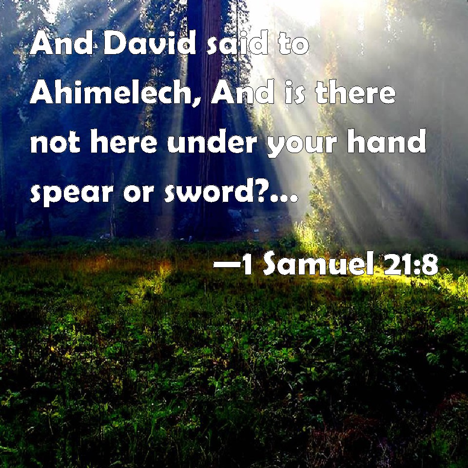 Choose a Background 1 Samuel 21:8 And David said to Ahimelech, And is there not here under your hand spear or sword? for I have neither brought my sword nor my weapons with me, because the king's business required haste. KJV: And David said unto Ahimelech, And is there not here under thine hand spear or sword? for I have neither brought my sword nor my weapons with me, because the king's business required haste. DRB: And David said to Achimelech: Hast thou here at hand a spear, or a sword? for I brought not my own sword, nor my own weapons with me, for the king's business required haste. DBT: And David said to Ahimelech, And is there not here under thy hand spear or sword? for I have neither brought my sword nor my weapons with me, for the king's business was urgent. ERV: And David said unto Ahimelech, And is there not here under thine hand spear or sword? for I have neither brought my sword nor my weapons with me, because the king's business required haste. WBT: And David said to Ahimelech, And is there not here under thy hand a spear or sword? for I have neither brought my sword nor my weapons with me, because the king's business required haste. WEB: David said to Ahimelech, "Isn't there here under your hand spear or sword? For I have neither brought my sword nor my weapons with me, because the king's business required haste." YLT: And David saith to Ahimelech, 'And is there not here under thy hand spear or sword? for neither my sword nor my vessels have I taken in my hand, for the matter of the king was urgent.'Links 1 Samuel 21:8 NIV • 1 Samuel 21:8 NLT • 1 Samuel 21:8 ESV • 1 Samuel 21:8 NASB • 1 Samuel 21:8 KJV • 1 Samuel 21:8 Interlinear • 1 Samuel 21:8 Commentaries • 1 Samuel 21:8 Parallel Texts • 1 Samuel 21:8 Bible Apps • 1 Samuel 21:8 Parallel • Bible Hub |