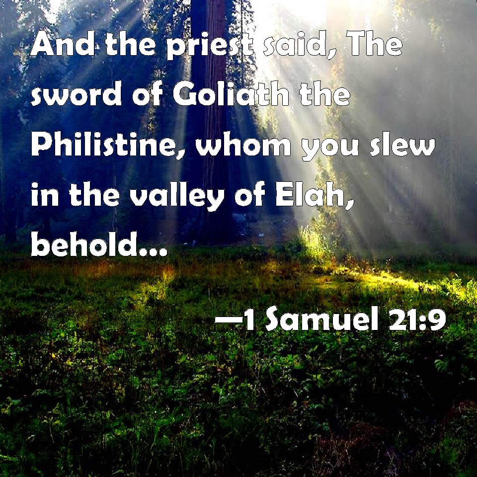 Choose a Background 1 Samuel 21:9 And the priest said, The sword of Goliath the Philistine, whom you slew in the valley of Elah, behold, it is here wrapped in a cloth behind the ephod: if you will take that, take it: for there is no other save that here. And David said, There is none like that; give it me. KJV: And the priest said, The sword of Goliath the Philistine, whom thou slewest in the valley of Elah, behold, it is here wrapped in a cloth behind the ephod: if thou wilt take that, take it: for there is no other save that here. And David said, There is none like that; give it me. DRB: And the priest said: Lo, here is the sword of Goliath the Philistine whom thou slewest in the valley of Terebinth, wrapped up in a cloth behind the ephod: if thou wilt take this, take it, for here is no other but this. And David said: There is none like that, give it me. DBT: And the priest said, The sword of Goliath the Philistine, whom thou slewest in the valley of terebinths, behold, it is here wrapped in a cloth behind the ephod; if thou wilt take that, take it; for there is no other save that here. And David said, There is none like that: give it me. ERV: And the priest said, The sword of Goliath the Philistine, whom thou slowest in the vale of Elah, behold, it is here wrapped in a cloth behind the ephod: if thou wilt take that, take it: for there is no other save that here. And David said, There is none like that; give it me. WBT: And the priest said, The sword of Goliath the Philistine, whom thou slewest in the valley of Elah, behold, it is here wrapped in a cloth behind the ephod: if thou wilt take that, take it: for there is no other save that here. And David said, There is none like that; give it to me. WEB: The priest said, "The sword of Goliath the Philistine, whom you killed in the valley of Elah, behold, it is here wrapped in a cloth behind the ephod. If you will take that, take it; for there is no other except that here." David said, "There is none like that. Give it to me." YLT: And the priest saith, 'The sword of Goliath the Philistine, whom thou didst smite in the valley of Elah, lo, it is wrapped in a garment behind the ephod, if it thou dost take to thyself, take; for there is none other save it in this place.' And David saith, 'There is none like it — give it to me.'Links 1 Samuel 21:9 NIV • 1 Samuel 21:9 NLT • 1 Samuel 21:9 ESV • 1 Samuel 21:9 NASB • 1 Samuel 21:9 KJV • 1 Samuel 21:9 Interlinear • 1 Samuel 21:9 Commentaries • 1 Samuel 21:9 Parallel Texts • 1 Samuel 21:9 Bible Apps • 1 Samuel 21:9 Parallel • Bible Hub |
