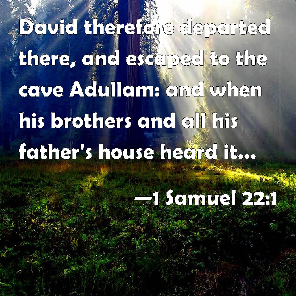 Choose a Background 1 Samuel 22:1 David therefore departed there, and escaped to the cave Adullam: and when his brothers and all his father's house heard it, they went down thither to him. KJV: David therefore departed thence, and escaped to the cave Adullam: and when his brethren and all his father's house heard it, they went down thither to him. DRB: David therefore went from thence and fled to the cave of Odollam. And when his brethren, and all his father's house had heard of it, they went down to him thither; DBT: And David departed thence, and escaped to the cave of Adullam. And his brethren and all his father's house heard it, and they went down thither to him. ERV: David therefore departed thence, and escaped to the cave of Adullam: and when his brethren and all his father's house heard it, they went down thither to him. WBT: David therefore departed thence, and escaped to the cave Adullam: and when his brethren and all his father's house heard it, they went down thither to him. WEB: David therefore departed there, and escaped to the cave of Adullam. When his brothers and all his father's house heard it, they went down there to him. YLT: And David goeth thence, and is escaped unto the cave of Adullam, and his brethren hear, and all the house of his father, and go down unto him thither;Links 1 Samuel 22:1 NIV • 1 Samuel 22:1 NLT • 1 Samuel 22:1 ESV • 1 Samuel 22:1 NASB • 1 Samuel 22:1 KJV • 1 Samuel 22:1 Interlinear • 1 Samuel 22:1 Commentaries • 1 Samuel 22:1 Parallel Texts • 1 Samuel 22:1 Bible Apps • 1 Samuel 22:1 Parallel • Bible Hub |