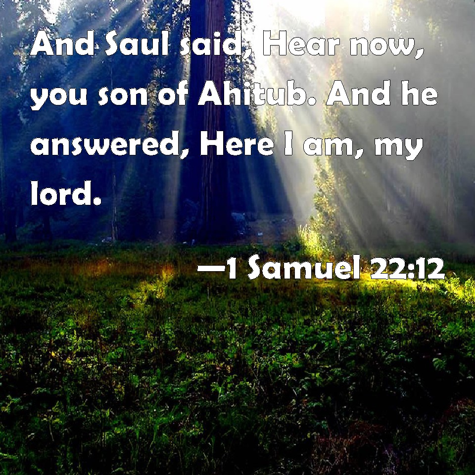 Choose a Background 1 Samuel 22:12 And Saul said, Hear now, you son of Ahitub. And he answered, Here I am, my lord. KJV: And Saul said, Hear now, thou son of Ahitub. And he answered, Here I am, my lord. DRB: And Saul said to Achimelech: Hear, thou son of Achitob. He answered: Here I am, my lord. DBT: And Saul said, Hear now, son of Ahitub. And he answered, Here I am, my lord. ERV: And Saul said, Hear now, thou son of Ahitub. And he answered, Here I am, my lord. WBT: And Saul said, Hear now, thou son of Ahitub. And he answered, Here I am, my lord. WEB: Saul said, "Hear now, you son of Ahitub." He answered, "Here I am, my lord." YLT: and Saul saith, 'Hear, I pray thee, son of Ahitub;' and he saith, 'Here am I, my lord.'Links 1 Samuel 22:12 NIV • 1 Samuel 22:12 NLT • 1 Samuel 22:12 ESV • 1 Samuel 22:12 NASB • 1 Samuel 22:12 KJV • 1 Samuel 22:12 Interlinear • 1 Samuel 22:12 Commentaries • 1 Samuel 22:12 Parallel Texts • 1 Samuel 22:12 Bible Apps • 1 Samuel 22:12 Parallel • Bible Hub |