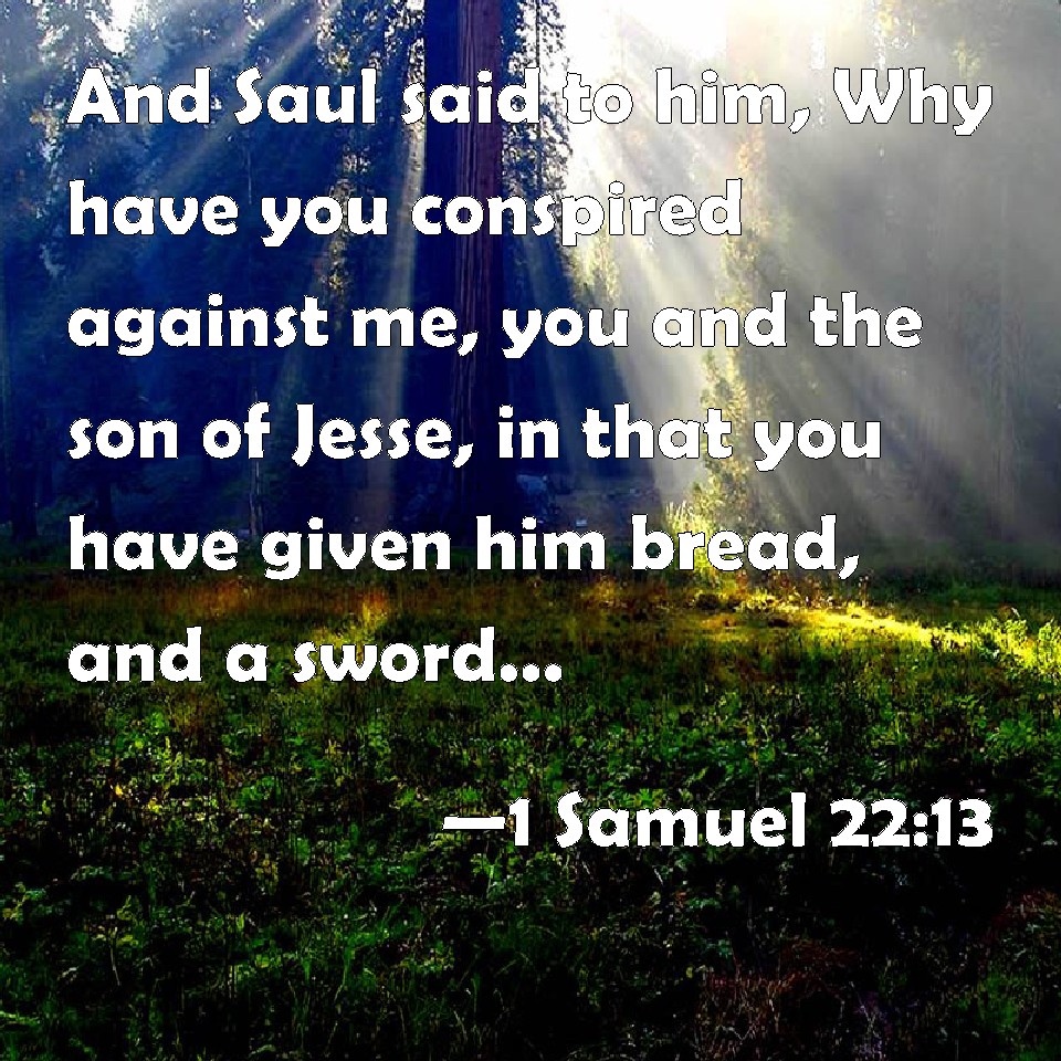 Choose a Background 1 Samuel 22:13 And Saul said to him, Why have you conspired against me, you and the son of Jesse, in that you have given him bread, and a sword, and have inquired of God for him, that he should rise against me, to lie in wait, as at this day? KJV: And Saul said unto him, Why have ye conspired against me, thou and the son of Jesse, in that thou hast given him bread, and a sword, and hast inquired of God for him, that he should rise against me, to lie in wait, as at this day? DRB: And Saul said to him: Why have you conspired against me, thou, and the son of Isai, and thou hast given him bread and a sword, and hast consulted the Lord for him, that he should rise up against me, continuing a traitor to this day. DBT: And Saul said to him, Why have ye conspired against me, thou and the son of Jesse, in that thou hast given him bread, and a sword, and hast inquired of God for him, that he should rise against me as a lier-in-wait, as at this day? ERV: And Saul said unto him, Why have ye conspired against me, thou and the son of Jesse, in that thou hast given him bread, and a sword, and hast inquired of God for him, that he should rise against me, to lie in wait, as at this day? WBT: And Saul said to him, Why have ye conspired against me, thou and the son of Jesse, in that thou hast given him bread, and a sword, and hast inquired of God for him, that he should rise against me, to lie in wait, as at this day? WEB: Saul said to him, "Why have you conspired against me, you and the son of Jesse, in that you have given him bread, and a sword, and have inquired of God for him, that he should rise against me, to lie in wait, as at this day?" YLT: And Saul saith unto him, 'Why have ye conspired against me, thou and the son of Jesse, by thy giving to him bread and a sword, and to ask for him at God, to rise against me, to lie in wait, as at this day?'Links 1 Samuel 22:13 NIV • 1 Samuel 22:13 NLT • 1 Samuel 22:13 ESV • 1 Samuel 22:13 NASB • 1 Samuel 22:13 KJV • 1 Samuel 22:13 Interlinear • 1 Samuel 22:13 Commentaries • 1 Samuel 22:13 Parallel Texts • 1 Samuel 22:13 Bible Apps • 1 Samuel 22:13 Parallel • Bible Hub |