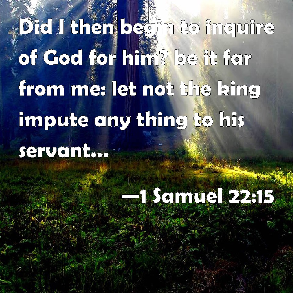 Choose a Background 1 Samuel 22:15 Did I then begin to inquire of God for him? be it far from me: let not the king impute any thing to his servant, nor to all the house of my father: for your servant knew nothing of all this, less or more. KJV: Did I then begin to inquire of God for him? be it far from me: let not the king impute any thing unto his servant, nor to all the house of my father: for thy servant knew nothing of all this, less or more. DRB: Did I begin to day to consult the Lord for him? far be this from me: let not the king suspect such a thing against his servant, or any one in all my father's house: for thy servant knew nothing of this matter, either little or great. DBT: Was it to-day that I began to inquire of God for him? be it far from me: let not the king charge anything to his servant, nor to all the house of my father; for thy servant knew nothing of all this, less or more. ERV: Have I today begun to inquire of God for him? be it far from me: let not the king impute any thing unto his servant, nor to all the house of my father: for thy servant knoweth nothing of all this, less or more. WBT: Did I then begin to inquire of God for him? be it far from me. Let not the king impute any thing to his servant, nor to all the house of my father: for thy servant knew nothing of all this, less or more. WEB: Have I today begun to inquire of God for him? Be it far from me! Don't let the king impute anything to his servant, nor to all the house of my father; for your servant knows nothing of all this, less or more." YLT: To-day have I begun to ask for him at God? far be it from me! let not the king lay anything against his servant, against any of the house of my father, for thy servant hath known nothing of all this, less or more.'Links 1 Samuel 22:15 NIV • 1 Samuel 22:15 NLT • 1 Samuel 22:15 ESV • 1 Samuel 22:15 NASB • 1 Samuel 22:15 KJV • 1 Samuel 22:15 Interlinear • 1 Samuel 22:15 Commentaries • 1 Samuel 22:15 Parallel Texts • 1 Samuel 22:15 Bible Apps • 1 Samuel 22:15 Parallel • Bible Hub |