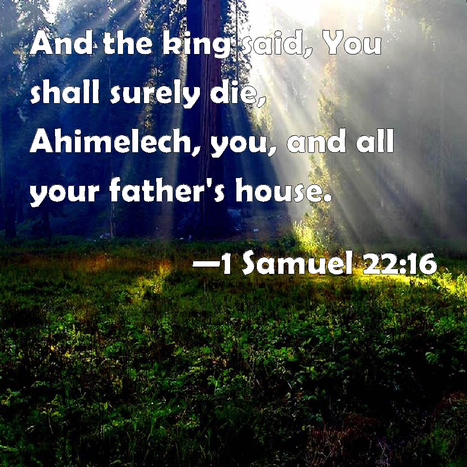 Choose a Background 1 Samuel 22:16 And the king said, You shall surely die, Ahimelech, you, and all your father's house. KJV: And the king said, Thou shalt surely die, Ahimelech, thou, and all thy father's house. DRB: And the king said: Dying thou shalt die, Achimelech, thou and all thy father's house. DBT: And the king said, Thou shalt certainly die, Ahimelech, thou, and all thy father's house. ERV: And the king said, Thou shalt surely die, Ahimelech, thou, and all thy father's house. WBT: And the king said, Thou shalt surely die, Ahimelech, thou, and all thy father's house. WEB: The king said, "You shall surely die, Ahimelech, you, and all your father's house." YLT: And the king saith, 'Thou dost surely die, Ahimelech, thou, and all the house of thy father.'Links 1 Samuel 22:16 NIV • 1 Samuel 22:16 NLT • 1 Samuel 22:16 ESV • 1 Samuel 22:16 NASB • 1 Samuel 22:16 KJV • 1 Samuel 22:16 Interlinear • 1 Samuel 22:16 Commentaries • 1 Samuel 22:16 Parallel Texts • 1 Samuel 22:16 Bible Apps • 1 Samuel 22:16 Parallel • Bible Hub |