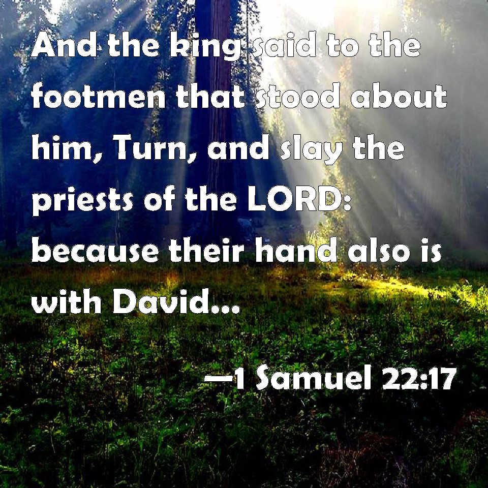 Choose a Background 1 Samuel 22:17 And the king said to the footmen that stood about him, Turn, and slay the priests of the LORD: because their hand also is with David, and because they knew when he fled, and did not show it to me. But the servants of the king would not put forth their hand to fall on the priests of the LORD. KJV: And the king said unto the footmen that stood about him, Turn, and slay the priests of the LORD; because their hand also is with David, and because they knew when he fled, and did not shew it to me. But the servants of the king would not put forth their hand to fall upon the priests of the LORD. DRB: And the king said to the messengers that stood about him: Turn, and kill the priests of the Lord, for their hand is with David, because they knew that he was fled, and they told it not to me. And the king's servants would not put forth their hands against the priests of the Lord. DBT: And the king said to the couriers that stood about him, Turn and put the priests of Jehovah to death; because their hand also is with David, and because they knew when he fled, and did not inform me. But the servants of the king were not willing to put forth their hand to fall on the priests of Jehovah. ERV: And the king said unto the guard that stood about him, Turn, and slay the priests of the LORD; because their hand also is with David, and because they knew that he fled, and did not disclose it to me. But the servants of the king would not put forth their hand to fall upon the priests of the LORD. WBT: And the king said to the footmen that stood about him, Turn, and slay the priests of the LORD: because their hand also is with David, and because they knew when he fled, and did not show it to me. But the servants of the king would not put forth their hand to fall upon the priests of the LORD. WEB: The king said to the guard who stood about him, "Turn, and kill the priests of Yahweh; because their hand also is with David, and because they knew that he fled, and didn't disclose it to me." But the servants of the king wouldn't put forth their hand to fall on the priests of Yahweh. YLT: And the king saith to runners, those standing by him, 'Turn round, and put to death the priests of Jehovah, because their hand also is with David, and because they have known that he is fleeing, and have not uncovered mine ear;' and the servants of the king have not been willing to put forth their hand to come against the priests of Jehovah.Links 1 Samuel 22:17 NIV • 1 Samuel 22:17 NLT • 1 Samuel 22:17 ESV • 1 Samuel 22:17 NASB • 1 Samuel 22:17 KJV • 1 Samuel 22:17 Interlinear • 1 Samuel 22:17 Commentaries • 1 Samuel 22:17 Parallel Texts • 1 Samuel 22:17 Bible Apps • 1 Samuel 22:17 Parallel • Bible Hub |