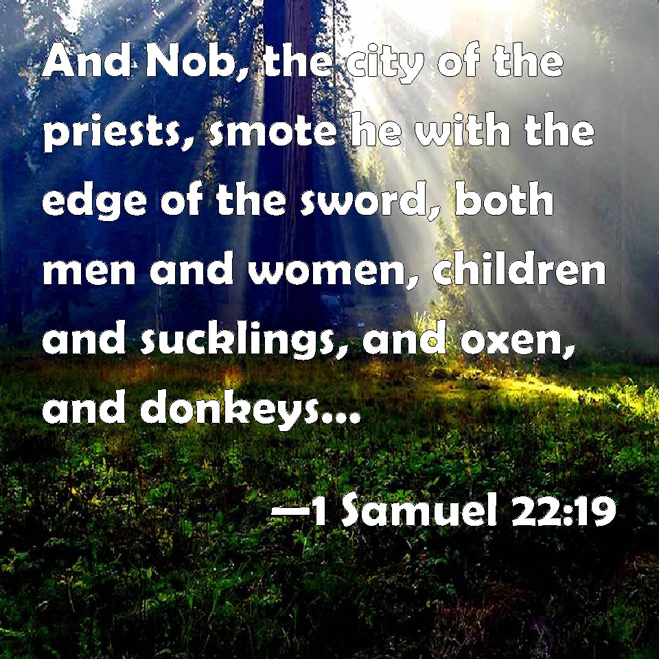 Choose a Background 1 Samuel 22:19 And Nob, the city of the priests, smote he with the edge of the sword, both men and women, children and sucklings, and oxen, and asses, and sheep, with the edge of the sword. KJV: And Nob, the city of the priests, smote he with the edge of the sword, both men and women, children and sucklings, and oxen, and asses, and sheep, with the edge of the sword. DRB: And Nobe the city of the priests he smote with the edge of his sword, both men and women, children, and sucklings, and ox and ass, and sheep with the edge of the sword. DBT: And Nob, the city of the priests, he smote with the edge of the sword, both men and women, infants and sucklings, and oxen, and asses, and sheep, with the edge of the sword. ERV: And Nob, the city of the priests, smote he with the edge of the sword, both men and women, children and sucklings, and oxen and asses and sheep, with the edge of the sword. WBT: And Nob, the city of the priests, he smote with the edge of the sword, both men and women, children and sucklings, and oxen, and asses, and sheep, with the edge of the sword. WEB: He struck Nob, the city of the priests, with the edge of the sword, both men and women, children and nursing babies, and cattle and donkeys and sheep, with the edge of the sword. YLT: and Nob, the city of the priests, he hath smitten by the mouth of the sword, from man even unto woman, from infant even unto suckling, and ox, and ass, and sheep, by the mouth of the sword.Links 1 Samuel 22:19 NIV • 1 Samuel 22:19 NLT • 1 Samuel 22:19 ESV • 1 Samuel 22:19 NASB • 1 Samuel 22:19 KJV • 1 Samuel 22:19 Interlinear • 1 Samuel 22:19 Commentaries • 1 Samuel 22:19 Parallel Texts • 1 Samuel 22:19 Bible Apps • 1 Samuel 22:19 Parallel • Bible Hub |