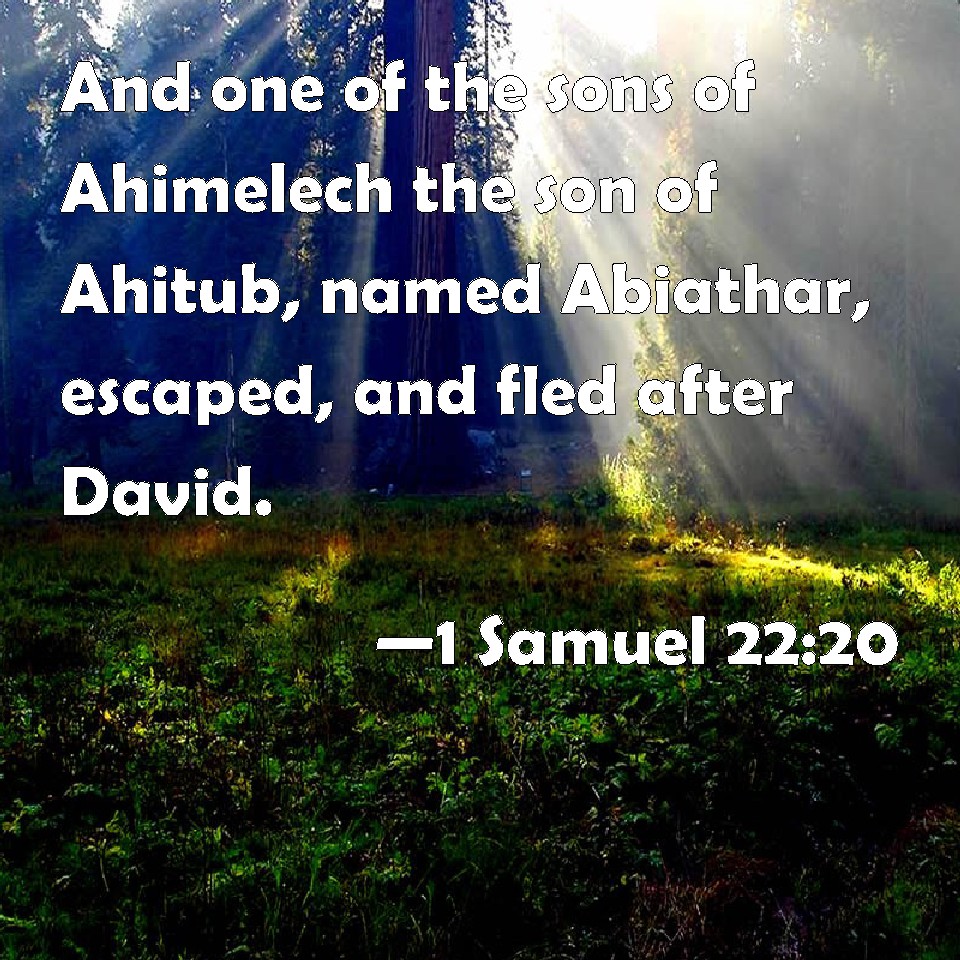 Choose a Background 1 Samuel 22:20 And one of the sons of Ahimelech the son of Ahitub, named Abiathar, escaped, and fled after David. KJV: And one of the sons of Ahimelech the son of Ahitub, named Abiathar, escaped, and fled after David. DRB: But one of the sons of Achimelech the son of Achitob, whose name was Abiathar, escaped, and fled to David, DBT: And one of the sons of Ahimelech the son of Ahitub, named Abiathar, escaped, and fled after David. ERV: And one of the sons of Ahimelech the son of Ahitub, named Abiathar, escaped, and fled after David. WBT: And one of the sons of Ahimelech the son of Ahitub, named Abiathar, escaped, and fled after David. WEB: One of the sons of Ahimelech, the son of Ahitub, named Abiathar, escaped, and fled after David. YLT: And there escapeth one son of Ahimelech, son of Ahitub, and his name is Abiathar, and he fleeth after David,Links 1 Samuel 22:20 NIV • 1 Samuel 22:20 NLT • 1 Samuel 22:20 ESV • 1 Samuel 22:20 NASB • 1 Samuel 22:20 KJV • 1 Samuel 22:20 Interlinear • 1 Samuel 22:20 Commentaries • 1 Samuel 22:20 Parallel Texts • 1 Samuel 22:20 Bible Apps • 1 Samuel 22:20 Parallel • Bible Hub |