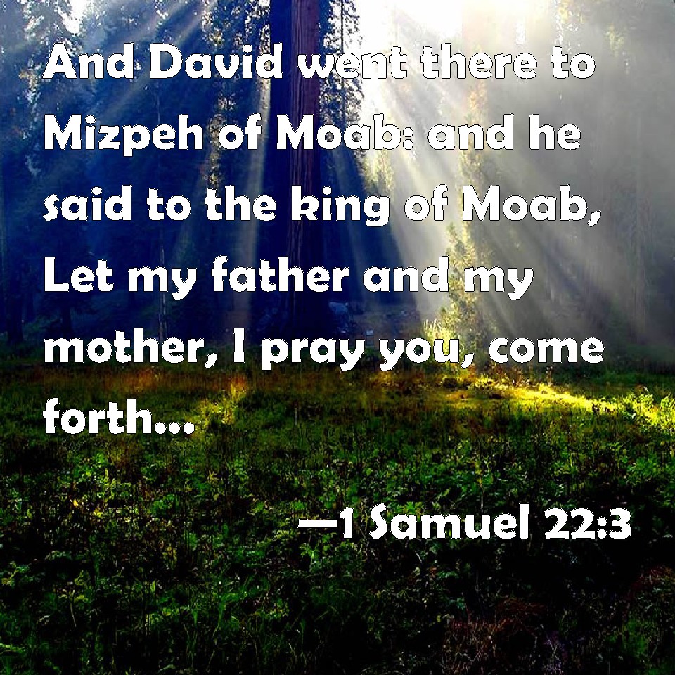 Choose a Background 1 Samuel 22:3 And David went there to Mizpeh of Moab: and he said to the king of Moab, Let my father and my mother, I pray you, come forth, and be with you, till I know what God will do for me. KJV: And David went thence to Mizpeh of Moab: and he said unto the king of Moab, Let my father and my mother, I pray thee, come forth, and be with you, till I know what God will do for me. DRB: And David departed from thence into Maspha of Moab: and he said to the king of Moab: Let my father and my mother tarry with you, I beseech thee, till I know what God will do for me. DBT: And David went thence to Mizpeh in Moab, and said to the king of Moab, Let my father and my mother, I pray thee, come forth amongst you, till I know what God will do for me. ERV: And David went thence to Mizpeh of Moab: and he said unto the king of Moab, Let my father and my mother, I pray thee, come forth, and be with you, till I know what God will do for me. WBT: And David went thence to Mizpeh of Moab: and he said to the king of Moab, Let my father and my mother, I pray thee, come forth, and be with you, till I know what God will do for me. WEB: David went there to Mizpeh of Moab, and he said to the king of Moab, "Please let my father and my mother come out with you, until I know what God will do for me." YLT: And David goeth thence to Mizpeh of Moab, and saith unto the king of Moab, 'Let, I pray thee, my father and my mother go out with you, till that I know what God doth for me;'Links 1 Samuel 22:3 NIV • 1 Samuel 22:3 NLT • 1 Samuel 22:3 ESV • 1 Samuel 22:3 NASB • 1 Samuel 22:3 KJV • 1 Samuel 22:3 Interlinear • 1 Samuel 22:3 Commentaries • 1 Samuel 22:3 Parallel Texts • 1 Samuel 22:3 Bible Apps • 1 Samuel 22:3 Parallel • Bible Hub |