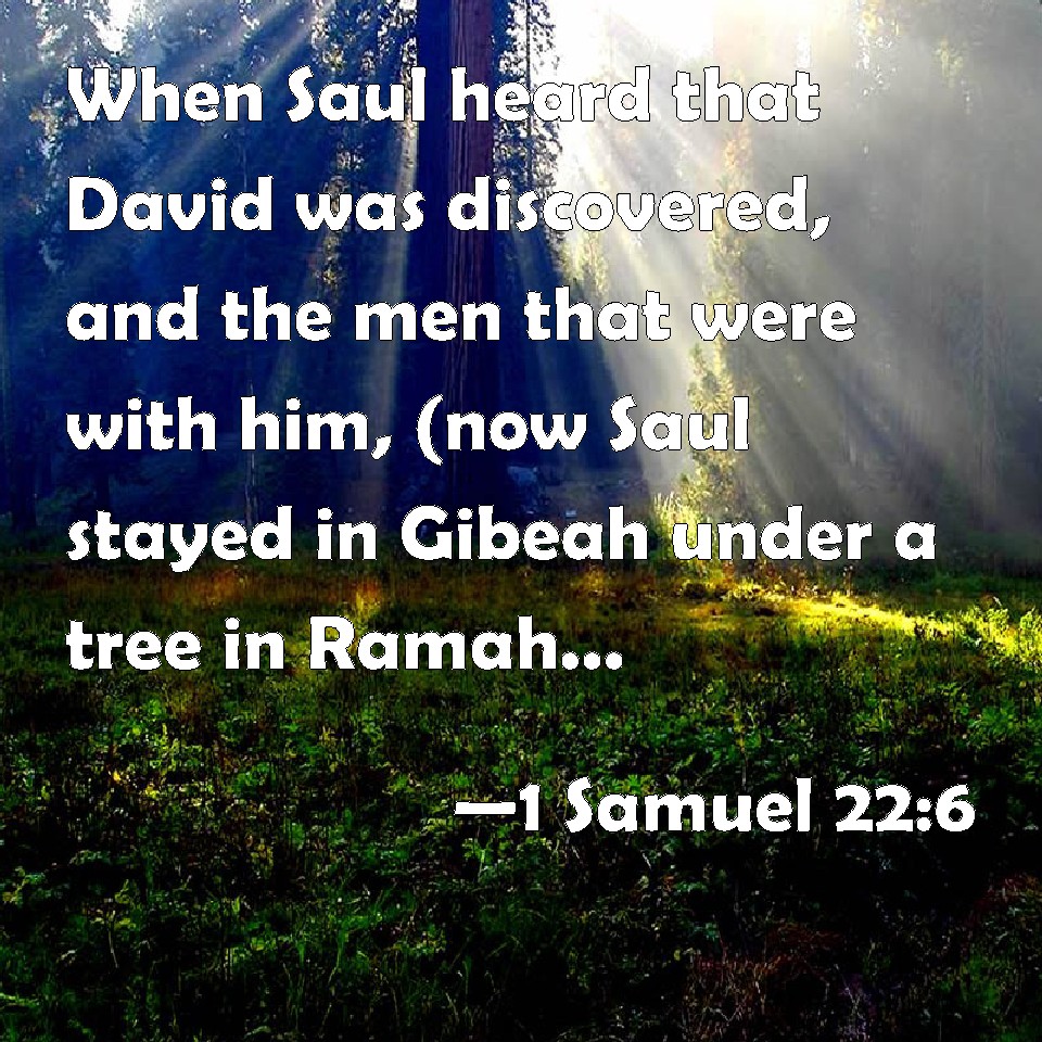Choose a Background 1 Samuel 22:6 When Saul heard that David was discovered, and the men that were with him, (now Saul stayed in Gibeah under a tree in Ramah, having his spear in his hand, and all his servants were standing about him;) KJV: When Saul heard that David was discovered, and the men that were with him, (now Saul abode in Gibeah under a tree in Ramah, having his spear in his hand, and all his servants were standing about him;) DRB: And Saul heard that David was seen, and the men that were with him. Now whilst Saul abode in Gabaa, and was in the wood, which is by Rama, having his spear in his hand, and all his servants were standing about him, DBT: And Saul heard that David was discovered, and the men that were with him. Now Saul was sitting in Gibeah under the tamarisk upon the height, having his spear in his hand, and all his servants were standing by him. ERV: And Saul heard that David was discovered, and the men that were with him: now Saul was sitting in Gibeah, under the tamarisk tree in Ramah, with his spear in his hand, and all his servants were standing about him. WBT: When Saul heard that David was discovered, and the men that were with him, (now Saul abode in Gibeah under a tree in Ramah, having his spear in his hand, and all his servants were standing about him;) WEB: Saul heard that David was discovered, and the men who were with him. Now Saul was sitting in Gibeah, under the tamarisk tree in Ramah, with his spear in his hand, and all his servants were standing about him. YLT: And Saul heareth that David hath become known, and the men who are with him, and Saul is abiding in Gibeah, under the grove in Ramah, and his spear is in his hand, and all his servants standing by him.Links 1 Samuel 22:6 NIV • 1 Samuel 22:6 NLT • 1 Samuel 22:6 ESV • 1 Samuel 22:6 NASB • 1 Samuel 22:6 KJV • 1 Samuel 22:6 Interlinear • 1 Samuel 22:6 Commentaries • 1 Samuel 22:6 Parallel Texts • 1 Samuel 22:6 Bible Apps • 1 Samuel 22:6 Parallel • Bible Hub |