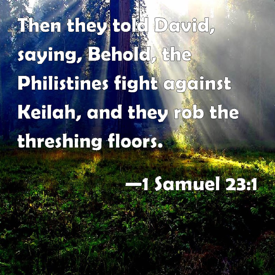 Choose a Background 1 Samuel 23:1 Then they told David, saying, Behold, the Philistines fight against Keilah, and they rob the threshing floors. KJV: Then they told David, saying, Behold, the Philistines fight against Keilah, and they rob the threshingfloors. DRB: And they told David, saying: Behold the Philistines fight against Ceila, and they rob the barns. DBT: And they told David, saying, Behold, the Philistines fight against Keilah, and they rob the threshing-floors. ERV: And they told David, saying, Behold, the Philistines are fighting against Keilah, and they rob the threshing-floors. WBT: Then they told David, saying, Behold, the Philistines fight against Keilah, and they rob the threshing-floors. WEB: David was told, "Behold, the Philistines are fighting against Keilah, and are robbing the threshing floors." YLT: And they declare to David, saying, 'Lo, the Philistines are fighting against Keilah, and they are spoiling the threshing-floors.'Links 1 Samuel 23:1 NIV • 1 Samuel 23:1 NLT • 1 Samuel 23:1 ESV • 1 Samuel 23:1 NASB • 1 Samuel 23:1 KJV • 1 Samuel 23:1 Interlinear • 1 Samuel 23:1 Commentaries • 1 Samuel 23:1 Parallel Texts • 1 Samuel 23:1 Bible Apps • 1 Samuel 23:1 Parallel • Bible Hub |
