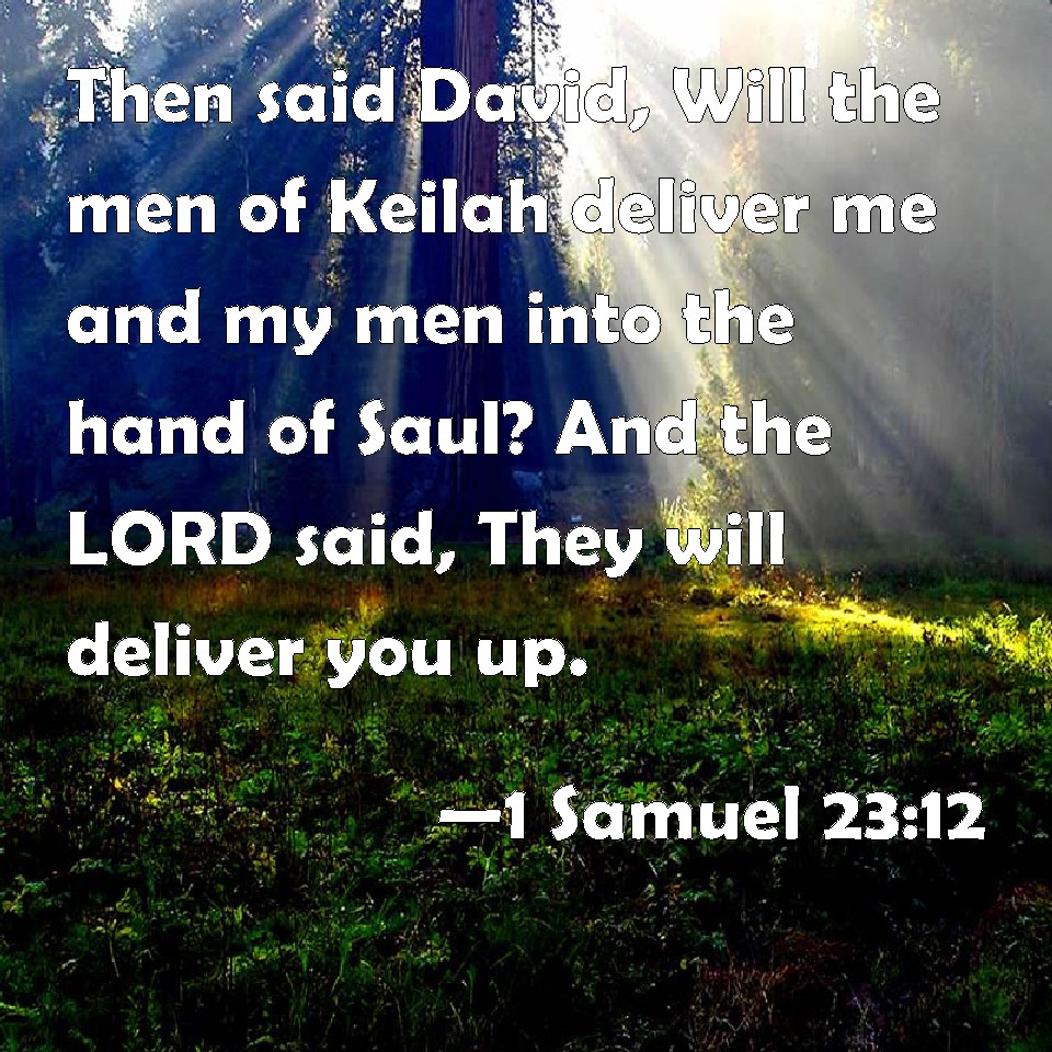Choose a Background 1 Samuel 23:12 Then said David, Will the men of Keilah deliver me and my men into the hand of Saul? And the LORD said, They will deliver you up. KJV: Then said David, Will the men of Keilah deliver me and my men into the hand of Saul? And the LORD said, They will deliver thee up. DRB: And David said: Will the men of Ceila deliver me, and my men, into the hands of Saul? And the Lord said: They will deliver thee up. DBT: And David said, Will the citizens of Keilah deliver up me and my men into the hand of Saul? And Jehovah said, They will deliver thee up. ERV: Then said David, Will the men of Keilah deliver up me and my men into the hand of Saul? And the LORD said, They will deliver thee up. WBT: Then said David, Will the men of Keilah deliver me and my men into the hand of Saul? And the LORD said, They will deliver thee up. WEB: Then David said, "Will the men of Keilah deliver me and my men into the hand of Saul?" Yahweh said, "They will deliver you up." YLT: And David saith, 'Do the possessors of Keilah shut me up, and my men, into the hand of Saul?' And Jehovah saith, 'They shut thee up.'Links 1 Samuel 23:12 NIV • 1 Samuel 23:12 NLT • 1 Samuel 23:12 ESV • 1 Samuel 23:12 NASB • 1 Samuel 23:12 KJV • 1 Samuel 23:12 Interlinear • 1 Samuel 23:12 Commentaries • 1 Samuel 23:12 Parallel Texts • 1 Samuel 23:12 Bible Apps • 1 Samuel 23:12 Parallel • Bible Hub |