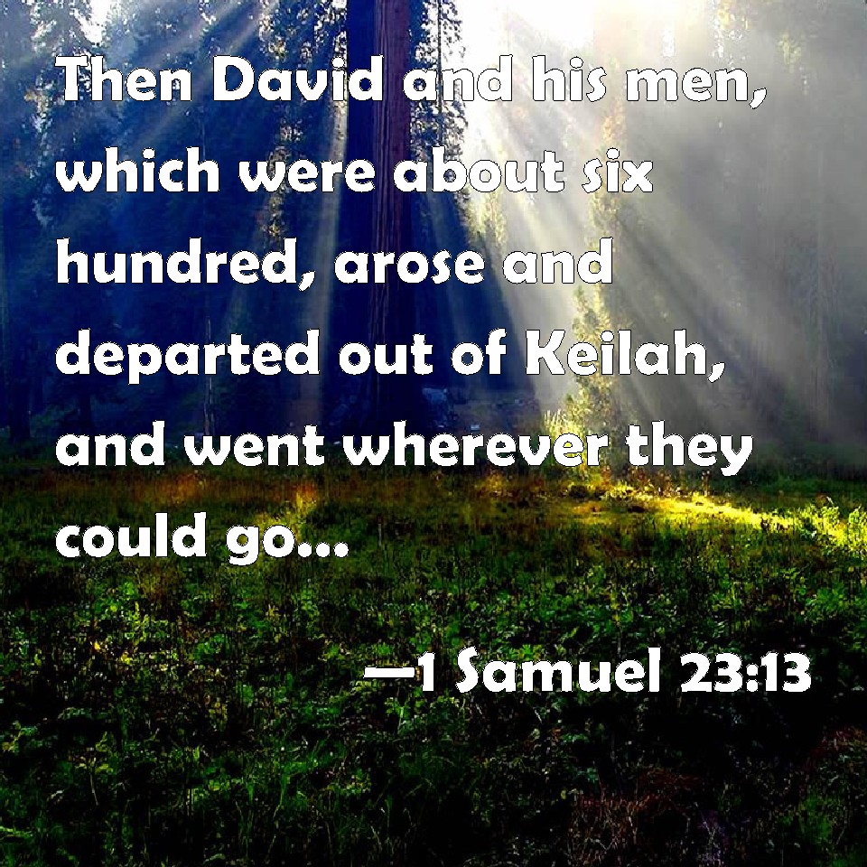 Choose a Background 1 Samuel 23:13 Then David and his men, which were about six hundred, arose and departed out of Keilah, and went wherever they could go. And it was told Saul that David was escaped from Keilah; and he declined to go forth. KJV: Then David and his men, which were about six hundred, arose and departed out of Keilah, and went whithersoever they could go. And it was told Saul that David was escaped from Keilah; and he forbare to go forth. DRB: Then David and his men, who were about six hundred, arose, and departing from Ceila, wandered up and down uncertain where they should stay: and it was told Saul that David was fled from Ceila, and had escaped: wherefore he forbore to go out. DBT: Then David and his men, about six hundred, arose and departed out of Keilah, and went whithersoever they could go. And it was told Saul that David had escaped from Keilah, and he forbore to go forth. ERV: Then David and his men, which were about six hundred, arose and departed out of Keilah, and went whithersoever they could go. And it was told Saul that David was escaped from Keilah; and he forbare to go forth. WBT: Then David and his men who were about six hundred, arose and departed from Keilah, and went whithersoever they could go. And it was told Saul that David had escaped from Keilah: and he forbore to go forth. WEB: Then David and his men, who were about six hundred, arose and departed out of Keilah, and went wherever they could go. It was told Saul that David was escaped from Keilah; and he gave up going there. YLT: And David riseth — and his men — about six hundred men, and they go out from Keilah, and go up and down where they go up and down; and to Saul it hath been declared that David hath escaped from Keilah, and he ceaseth to go out.Links 1 Samuel 23:13 NIV • 1 Samuel 23:13 NLT • 1 Samuel 23:13 ESV • 1 Samuel 23:13 NASB • 1 Samuel 23:13 KJV • 1 Samuel 23:13 Interlinear • 1 Samuel 23:13 Commentaries • 1 Samuel 23:13 Parallel Texts • 1 Samuel 23:13 Bible Apps • 1 Samuel 23:13 Parallel • Bible Hub |