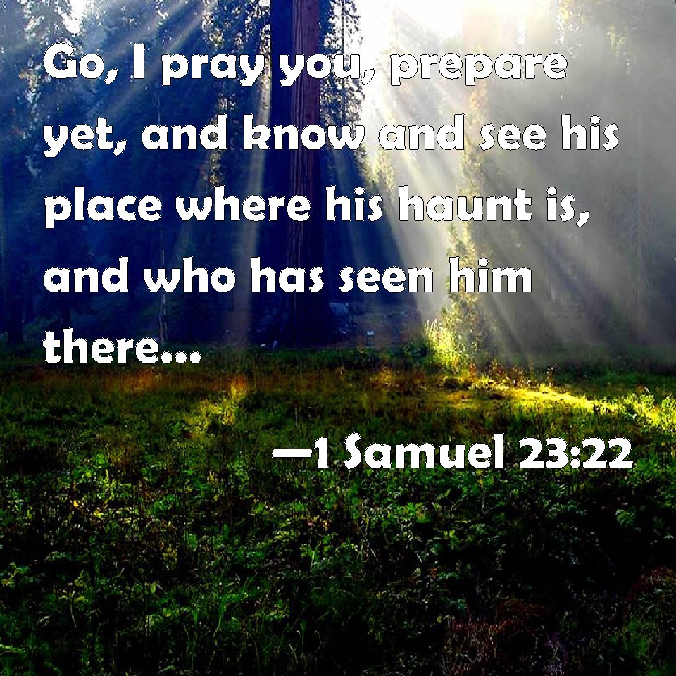 Choose a Background 1 Samuel 23:22 Go, I pray you, prepare yet, and know and see his place where his haunt is, and who has seen him there: for it is told me that he deals very subtly. KJV: Go, I pray you, prepare yet, and know and see his place where his haunt is, and who hath seen him there: for it is told me that he dealeth very subtilly. DRB: Go therefore, I pray you, and use all diligence, and curiously inquire, and consider the place where his foot is, and who hath seen him there: for he thinketh of me, that I lie craftily in wait for him. DBT: Go, I pray you, make yet more sure, and know and see his place where his track is, who has seen him there; for it is told me that he deals very subtilly. ERV: Go, I pray you, make yet more sure, and know and see his place where his haunt is, and who hath seen him there: for it is told me that he dealeth very subtilly. WBT: Go, I pray you, prepare yet, and know, and see his place where his haunt is, and who hath seen him there: for it is told to me that he dealeth very subtilly. WEB: Please go make yet more sure, and know and see his place where his haunt is, [and] who has seen him there; for it is told me that he deals very subtly. YLT: go, I pray you, prepare yet, and know and see his place where his foot is; who hath seen him there? for one hath said unto me, He is very subtile.Links 1 Samuel 23:22 NIV • 1 Samuel 23:22 NLT • 1 Samuel 23:22 ESV • 1 Samuel 23:22 NASB • 1 Samuel 23:22 KJV • 1 Samuel 23:22 Interlinear • 1 Samuel 23:22 Commentaries • 1 Samuel 23:22 Parallel Texts • 1 Samuel 23:22 Bible Apps • 1 Samuel 23:22 Parallel • Bible Hub |