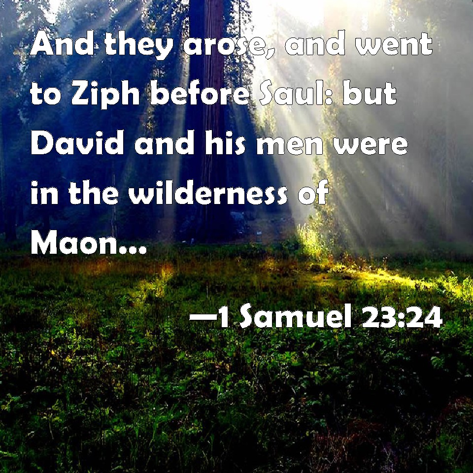 Choose a Background 1 Samuel 23:24 And they arose, and went to Ziph before Saul: but David and his men were in the wilderness of Maon, in the plain on the south of Jeshimon. KJV: And they arose, and went to Ziph before Saul: but David and his men were in the wilderness of Maon, in the plain on the south of Jeshimon. DRB: And they arose and went to Ziph before Saul: and David and his men were in the desert of Maon, in the plain at the right hand of Jesimon. DBT: And they arose and went to Ziph before Saul; but David and his men were in the wilderness of Maon, in the plain on the south of the waste. ERV: And they arose, and went to Ziph before Saul: but David and his men were in the wilderness of Maon, in the Arabah on the south of the desert. WBT: And they arose, and went to Ziph before Saul: but David and his men were in the wilderness of Maon, in the plain on the south of Jeshimon. WEB: They arose, and went to Ziph before Saul: but David and his men were in the wilderness of Maon, in the Arabah on the south of the desert. YLT: And they rise and go to Ziph before Saul, and David and his men are in the wilderness of Maon, in the plain, at the south of the desolate place.Links 1 Samuel 23:24 NIV • 1 Samuel 23:24 NLT • 1 Samuel 23:24 ESV • 1 Samuel 23:24 NASB • 1 Samuel 23:24 KJV • 1 Samuel 23:24 Interlinear • 1 Samuel 23:24 Commentaries • 1 Samuel 23:24 Parallel Texts • 1 Samuel 23:24 Bible Apps • 1 Samuel 23:24 Parallel • Bible Hub |