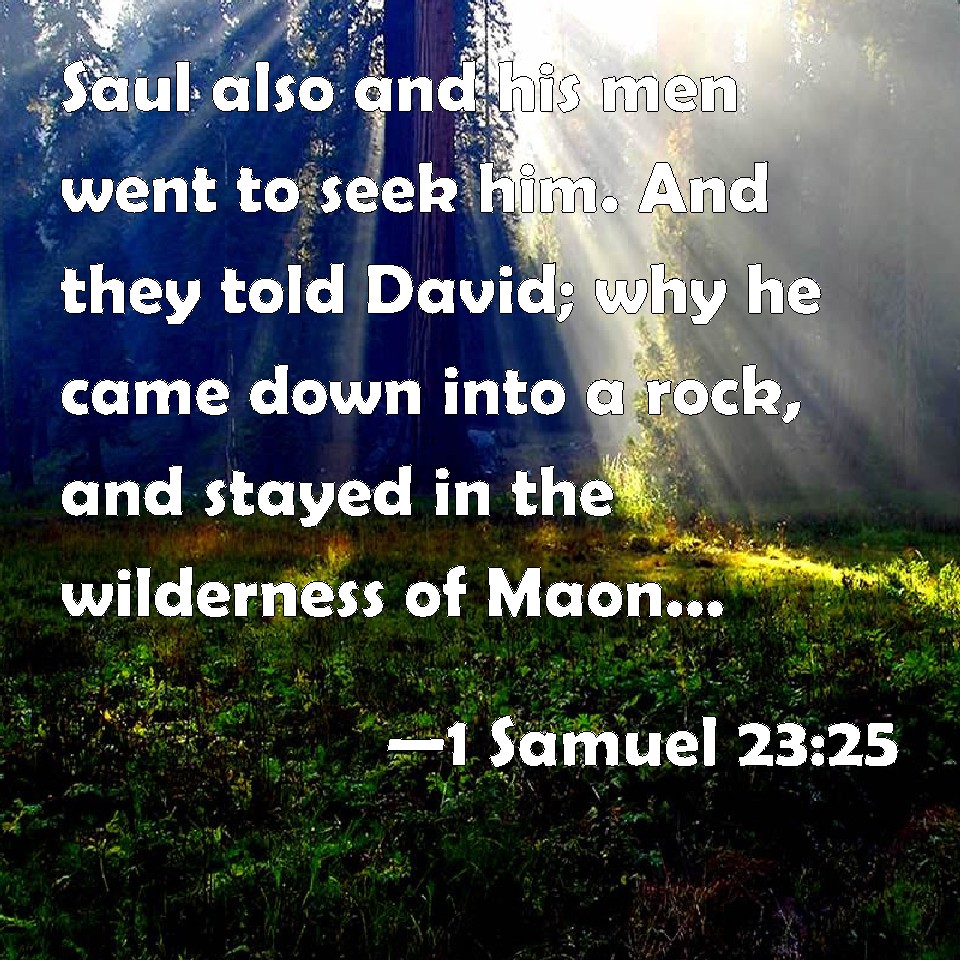 Choose a Background 1 Samuel 23:25 Saul also and his men went to seek him. And they told David; why he came down into a rock, and stayed in the wilderness of Maon. And when Saul heard that, he pursued after David in the wilderness of Maon. KJV: Saul also and his men went to seek him. And they told David: wherefore he came down into a rock, and abode in the wilderness of Maon. And when Saul heard that, he pursued after David in the wilderness of Maon. DRB: Then Saul and his men went to seek him: and it was told David, and forthwith he went down to the rock, and abode in the wilderness of Maon: and when Saul had heard of it he pursued after David in the wilderness of Maon. DBT: And Saul and his men went to seek him. And they told David; and he came down from the rock, and abode in the wilderness of Maon. And Saul heard that, and he pursued after David in the wilderness of Maon. ERV: And Saul and his men went to seek him. And they told David: wherefore he came down to the rock, and abode in the wilderness of Maon. And when Saul heard that, he pursued after David in the wilderness of Maon. WBT: Saul also and his men went to seek him. And they told David: wherefore he came down into a rock, and abode in the wilderness of Maon. And when Saul heard that, he pursued after David in the wilderness of Maon. WEB: Saul and his men went to seek him. When David was told, he went down to the rock, and stayed in the wilderness of Maon. When Saul heard [that], he pursued after David in the wilderness of Maon. YLT: And Saul and his men go to seek, and they declare to David, and he goeth down the rock, and abideth in the wilderness of Maon; and Saul heareth, and pursueth after David to the wilderness of Maon.Links 1 Samuel 23:25 NIV • 1 Samuel 23:25 NLT • 1 Samuel 23:25 ESV • 1 Samuel 23:25 NASB • 1 Samuel 23:25 KJV • 1 Samuel 23:25 Interlinear • 1 Samuel 23:25 Commentaries • 1 Samuel 23:25 Parallel Texts • 1 Samuel 23:25 Bible Apps • 1 Samuel 23:25 Parallel • Bible Hub |