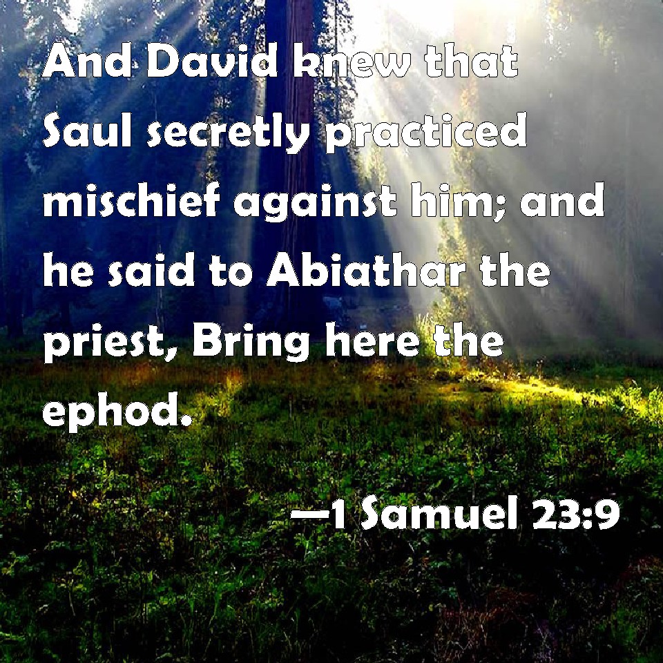 Choose a Background 1 Samuel 23:9 And David knew that Saul secretly practiced mischief against him; and he said to Abiathar the priest, Bring here the ephod. KJV: And David knew that Saul secretly practised mischief against him; and he said to Abiathar the priest, Bring hither the ephod. DRB: Now when David understood, that Saul secretly prepared evil against him, he said to Abiathar the priest: Bring hither the ephod. DBT: And when David knew that Saul devised mischief against him, he said to Abiathar the priest, Bring the ephod. ERV: And David knew that Saul devised mischief against him; and he said to Abiathar the priest, Bring hither the ephod. WBT: And David knew that Saul secretly plotted mischief against him; and he said to Abiathar the priest, Bring hither the ephod. WEB: David knew that Saul was devising mischief against him; and he said to Abiathar the priest, "Bring the ephod here." YLT: And David knoweth that against him Saul is devising the evil, and saith unto Abiathar the priest, 'Bring nigh the ephod.'Links 1 Samuel 23:9 NIV • 1 Samuel 23:9 NLT • 1 Samuel 23:9 ESV • 1 Samuel 23:9 NASB • 1 Samuel 23:9 KJV • 1 Samuel 23:9 Interlinear • 1 Samuel 23:9 Commentaries • 1 Samuel 23:9 Parallel Texts • 1 Samuel 23:9 Bible Apps • 1 Samuel 23:9 Parallel • Bible Hub |