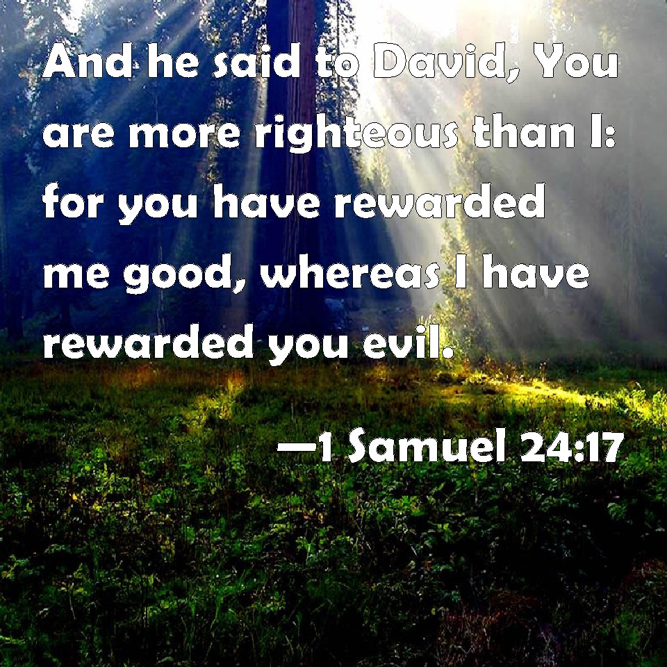 Choose a Background 1 Samuel 24:17 And he said to David, You are more righteous than I: for you have rewarded me good, whereas I have rewarded you evil. KJV: And he said to David, Thou art more righteous than I: for thou hast rewarded me good, whereas I have rewarded thee evil. DRB: And he said to David: Thou art more just than I: for thou hast done good to me, and I have rewarded thee with evil. DBT: And he said to David, Thou art more righteous than I; for thou hast rewarded me good, whereas I have rewarded thee evil. ERV: And he said to David, Thou art more righteous than I: for thou hast rendered unto me good, whereas I have rendered unto thee evil. WBT: And he said to David, thou art more righteous than I: for thou hast rewarded me with good, whereas I have rewarded thee with evil. WEB: He said to David, "You are more righteous than I; for you have done good to me, whereas I have done evil to you. YLT: And he saith unto David, 'More righteous thou art than I; for thou hast done me good, and I have done thee evil;Links 1 Samuel 24:17 NIV • 1 Samuel 24:17 NLT • 1 Samuel 24:17 ESV • 1 Samuel 24:17 NASB • 1 Samuel 24:17 KJV • 1 Samuel 24:17 Interlinear • 1 Samuel 24:17 Commentaries • 1 Samuel 24:17 Parallel Texts • 1 Samuel 24:17 Bible Apps • 1 Samuel 24:17 Parallel • Bible Hub |