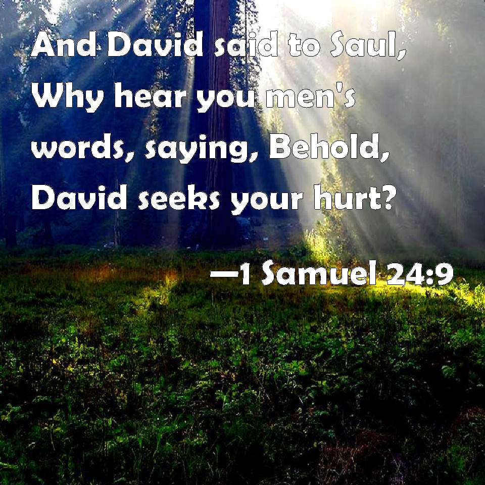 Choose a Background 1 Samuel 24:9 And David said to Saul, Why hear you men's words, saying, Behold, David seeks your hurt? KJV: And David said to Saul, Wherefore hearest thou men's words, saying, Behold, David seeketh thy hurt? DRB: And said to Saul: Why dost thou hear the words of men that say David seeketh thy hurt? DBT: And David said to Saul, Why dost thou listen to words of men, saying, Behold, David seeks thy hurt? ERV: And David said to Saul, Wherefore hearkenest thou to men's words, saying, Behold, David seeketh thy hurt? WBT: And David said to Saul, Why hearest thou men's words, saying, Behold, David seeketh thy hurt? WEB: David said to Saul, "Why do you listen to men's words, saying, 'Behold, David seeks your hurt?' YLT: And David saith to Saul, 'Why dost thou hear the words of man, saying, Lo, David is seeking thine evil?Links 1 Samuel 24:9 NIV • 1 Samuel 24:9 NLT • 1 Samuel 24:9 ESV • 1 Samuel 24:9 NASB • 1 Samuel 24:9 KJV • 1 Samuel 24:9 Interlinear • 1 Samuel 24:9 Commentaries • 1 Samuel 24:9 Parallel Texts • 1 Samuel 24:9 Bible Apps • 1 Samuel 24:9 Parallel • Bible Hub |