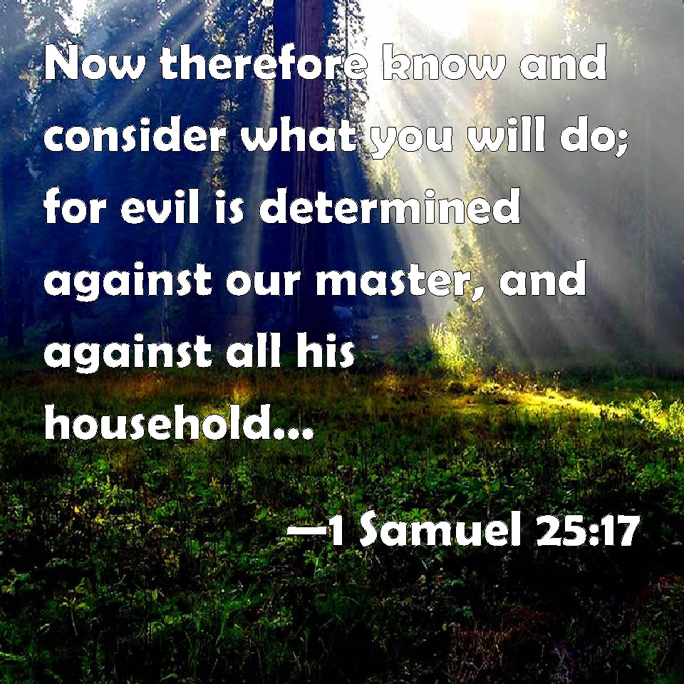Choose a Background 1 Samuel 25:17 Now therefore know and consider what you will do; for evil is determined against our master, and against all his household: for he is such a son of Belial, that a man cannot speak to him. KJV: Now therefore know and consider what thou wilt do; for evil is determined against our master, and against all his household: for he is such a son of Belial, that a man cannot speak to him. DRB: Wherefore consider, and think what thou hast to do: for evil is determined against thy husband, and against thy house, and he is a son of Belial, so that no man can speak to him. DBT: And now know and consider what thou wilt do, for evil is determined against our master, and against all his household; and he is such a son of Belial, that one cannot speak to him. ERV: Now therefore know and consider what thou wilt do; for evil is determined against our master, and against all his house: for he is such a son of Belial, that one cannot speak to him. WBT: Now therefore know and consider what thou wilt do: for evil is determined against our master, and against all his household: for he is such a son of Belial, that a man cannot speak to him. WEB: Now therefore know and consider what you will do; for evil is determined against our master, and against all his house; for he is such a worthless fellow that one can't speak to him." YLT: And, now, know and consider what thou dost; for evil hath been determined against our lord, and against all his house, and he is too much a son of worthlessness to be spoken to.'Links 1 Samuel 25:17 NIV • 1 Samuel 25:17 NLT • 1 Samuel 25:17 ESV • 1 Samuel 25:17 NASB • 1 Samuel 25:17 KJV • 1 Samuel 25:17 Interlinear • 1 Samuel 25:17 Commentaries • 1 Samuel 25:17 Parallel Texts • 1 Samuel 25:17 Bible Apps • 1 Samuel 25:17 Parallel • Bible Hub |