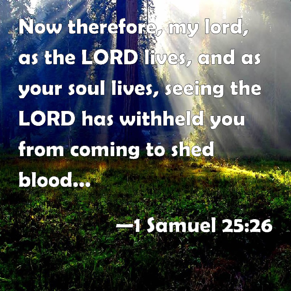 Choose a Background 1 Samuel 25:26 Now therefore, my lord, as the LORD lives, and as your soul lives, seeing the LORD has withheld you from coming to shed blood, and from avenging yourself with your own hand, now let your enemies, and they that seek evil to my lord, be as Nabal. KJV: Now therefore, my lord, as the LORD liveth, and as thy soul liveth, seeing the LORD hath withholden thee from coming to shed blood, and from avenging thyself with thine own hand, now let thine enemies, and they that seek evil to my lord, be as Nabal. DRB: Now therefore, my lord, the Lord liveth, and thy soul liveth, who hath withholden thee from coming to blood, and hath saved thy hand to thee: and now let thy enemies be as Nabal, and all they that seek evil to my lord. DBT: And now, my lord, as Jehovah liveth, and as thy soul liveth, seeing Jehovah has restrained thee from coming with bloodshed, and from avenging thyself with thine own hand, now let thine enemies, and they that seek evil to my lord, be as Nabal. ERV: Now therefore, my lord, as the LORD liveth, and as thy soul liveth, seeing the LORD hath withholden thee from bloodguiltiness, and from avenging thyself with thine own hand, now therefore let thine enemies, and them that seek evil to my lord, be as Nabal. WBT: Now therefore, my lord, as the LORD liveth, and as thy soul liveth, seeing the LORD hath withheld thee from coming to shed blood, and from avenging thyself with thy own hand, now let thy enemies, and they that seek evil to my lord, be as Nabal. WEB: Now therefore, my lord, as Yahweh lives, and as your soul lives, since Yahweh has withheld you from blood guiltiness, and from avenging yourself with your own hand, now therefore let your enemies, and those who seek evil to my lord, be as Nabal. YLT: and now, my lord, Jehovah liveth, and thy soul liveth, in that Jehovah hath withheld thee from coming in with blood, and to save thy hand to thee — now let thine enemies be as Nabal, even those seeking evil unto my lord.Links 1 Samuel 25:26 NIV • 1 Samuel 25:26 NLT • 1 Samuel 25:26 ESV • 1 Samuel 25:26 NASB • 1 Samuel 25:26 KJV • 1 Samuel 25:26 Interlinear • 1 Samuel 25:26 Commentaries • 1 Samuel 25:26 Parallel Texts • 1 Samuel 25:26 Bible Apps • 1 Samuel 25:26 Parallel • Bible Hub |