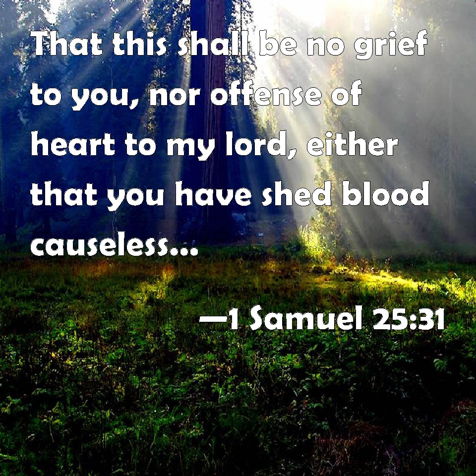 Choose a Background 1 Samuel 25:31 That this shall be no grief to you, nor offense of heart to my lord, either that you have shed blood causeless, or that my lord has avenged himself: but when the LORD shall have dealt well with my lord, then remember your handmaid. KJV: That this shall be no grief unto thee, nor offence of heart unto my lord, either that thou hast shed blood causeless, or that my lord hath avenged himself: but when the LORD shall have dealt well with my lord, then remember thine handmaid. DRB: This shall not be an occasion of grief to thee, and a scruple of heart to my lord, that thou hast shed innocent blood, or hast revenged thyself: and when the Lord shall have done well by my lord, thou shalt remember thy handmaid. DBT: that this shall be no stumbling-block to thee, nor offence of heart for my lord, either that thou hast shed blood without cause, or that my lord has avenged himself. And when Jehovah shall deal well with my lord, then remember thy handmaid. ERV: that this shall be no grief unto thee, nor offence of heart unto my lord, either that thou hast shed blood causeless, or that my lord hath avenged himself: and when the LORD shall have dealt well with my lord, then remember thine handmaid. WBT: That this will be no grief to thee, nor offense of heart to my lord, either that thou hast shed blood without cause, or that my lord hath avenged himself: but when the LORD shall have dealt well with my lord, then remember thy handmaid. WEB: that this shall be no grief to you, nor offense of heart to my lord, either that you have shed blood without cause, or that my lord has avenged himself. When Yahweh has dealt well with my lord, then remember your handmaid." YLT: that this is not to thee for a stumbling-block, and for an offence of heart to my lord — either to shed blood for nought, or my lord's restraining himself; and Jehovah hath done good to my lord, and thou hast remembered thy handmaid.'Links 1 Samuel 25:31 NIV • 1 Samuel 25:31 NLT • 1 Samuel 25:31 ESV • 1 Samuel 25:31 NASB • 1 Samuel 25:31 KJV • 1 Samuel 25:31 Interlinear • 1 Samuel 25:31 Commentaries • 1 Samuel 25:31 Parallel Texts • 1 Samuel 25:31 Bible Apps • 1 Samuel 25:31 Parallel • Bible Hub |