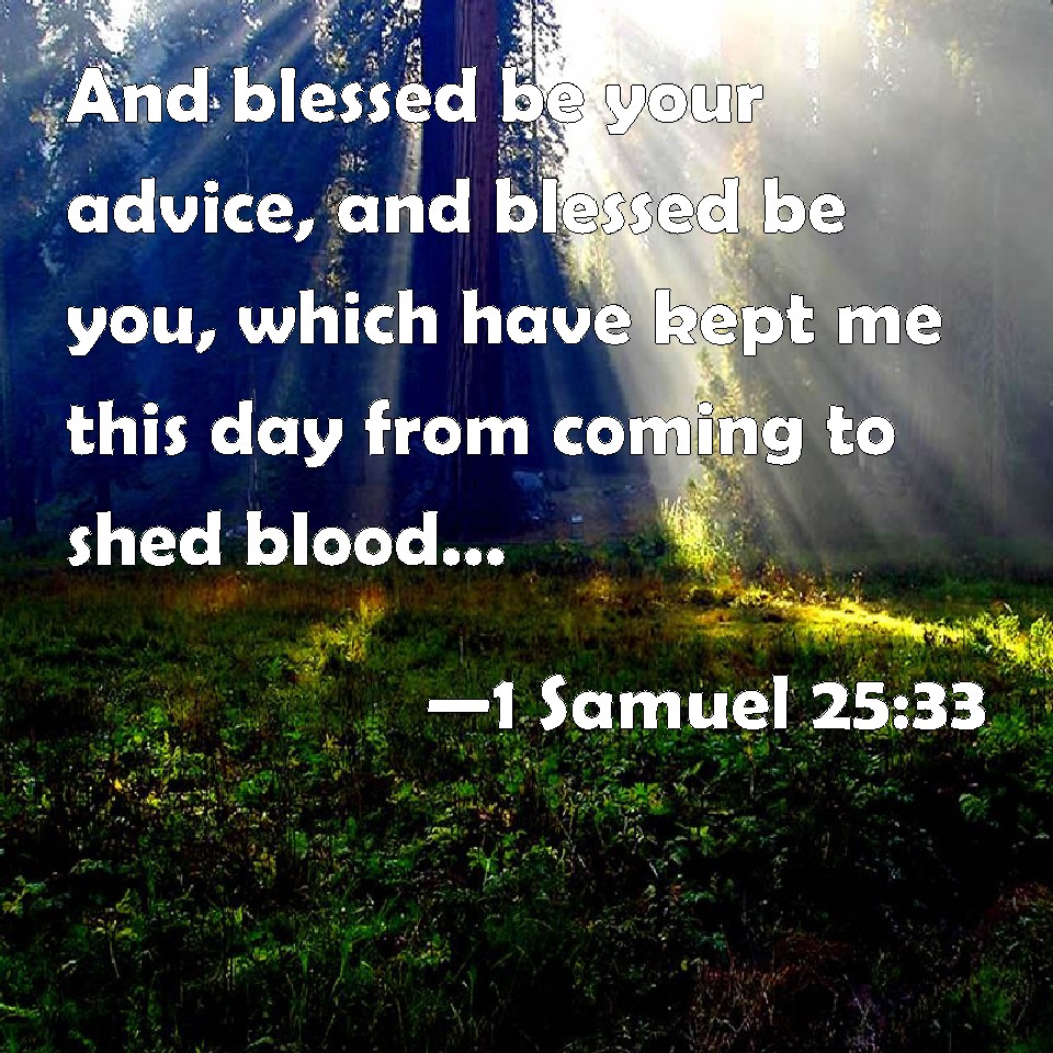 Choose a Background 1 Samuel 25:33 And blessed be your advice, and blessed be you, which have kept me this day from coming to shed blood, and from avenging myself with my own hand. KJV: And blessed be thy advice, and blessed be thou, which hast kept me this day from coming to shed blood, and from avenging myself with mine own hand. DRB: And blessed be thou, who hast kept me to day, from coming to blood, and revenging me with my own hand. DBT: And blessed be thy discernment, and blessed be thou, who hast kept me this day from coming with bloodshed, and from avenging myself with mine own hand. ERV: and blessed be thy wisdom, and blessed be thou, which hast kept me this day from bloodguiltiness, and from avenging myself with mine own hand. WBT: And blessed be thy advice, and blessed be thou, who hast kept me this day from coming to shed blood, and from avenging myself with my own hand. WEB: Blessed is your discretion, and blessed are you, that have kept me this day from blood guiltiness, and from avenging myself with my own hand. YLT: and blessed is thy discretion, and blessed art thou in that thou hast restrained me this day from coming in with blood, and to restrain my hand to myself.Links 1 Samuel 25:33 NIV • 1 Samuel 25:33 NLT • 1 Samuel 25:33 ESV • 1 Samuel 25:33 NASB • 1 Samuel 25:33 KJV • 1 Samuel 25:33 Interlinear • 1 Samuel 25:33 Commentaries • 1 Samuel 25:33 Parallel Texts • 1 Samuel 25:33 Bible Apps • 1 Samuel 25:33 Parallel • Bible Hub |
