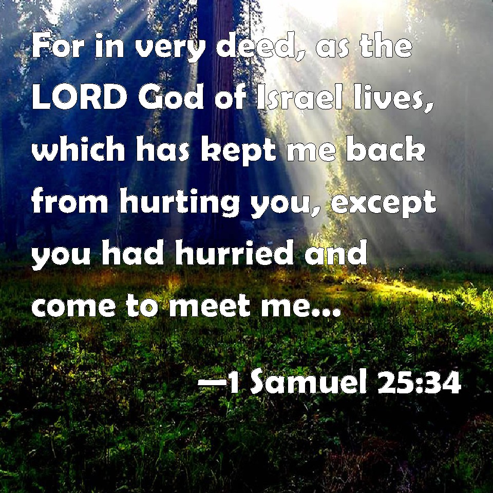 Choose a Background 1 Samuel 25:34 For in very deed, as the LORD God of Israel lives, which has kept me back from hurting you, except you had hurried and come to meet me, surely there had not been left to Nabal by the morning light any that urinates against the wall. KJV: For in very deed, as the LORD God of Israel liveth, which hath kept me back from hurting thee, except thou hadst hasted and come to meet me, surely there had not been left unto Nabal by the morning light any that pisseth against the wall. DRB: Otherwise as the Lord liveth the God of Israel, who hath withholden me from doing thee any evil: if thou hadst not quickly come to meet me, there had not been left to Nabal by the morning light any that pisseth against the wall. DBT: But indeed, as Jehovah the God of Israel liveth, who has restrained me from hurting thee, except thou hadst hasted and come to meet me, there had not been left to Nabal by the morning light any male. ERV: For in very deed, as the LORD, the God of Israel, liveth, which hath withholden me from hurting thee, except thou hadst hasted and come to meet me, surely there had not been left unto Nabal by the morning light so much as one man child. WBT: For in very deed, as the LORD God of Israel liveth, who hath kept me back from hurting thee, except thou hadst hasted and come to meet me, surely there had not been left to Nabal by the morning light any male person. WEB: For indeed, as Yahweh, the God of Israel, lives, who has withheld me from hurting you, unless you had hurried and come to meet me, surely there wouldn't have been left to Nabal by the morning light so much as one who urinates on a wall." YLT: And yet, Jehovah liveth, God of Israel, who hath kept me back from doing evil with thee, for unless thou hadst hasted, and dost come to meet me, surely there had not been left to Nabal till the light of the morning, of those sitting on the wall.'Links 1 Samuel 25:34 NIV • 1 Samuel 25:34 NLT • 1 Samuel 25:34 ESV • 1 Samuel 25:34 NASB • 1 Samuel 25:34 KJV • 1 Samuel 25:34 Interlinear • 1 Samuel 25:34 Commentaries • 1 Samuel 25:34 Parallel Texts • 1 Samuel 25:34 Bible Apps • 1 Samuel 25:34 Parallel • Bible Hub |