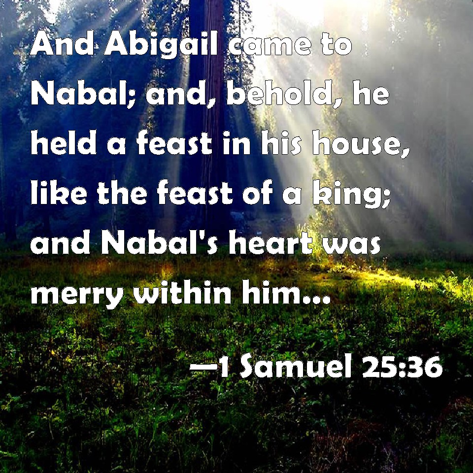 Choose a Background 1 Samuel 25:36 And Abigail came to Nabal; and, behold, he held a feast in his house, like the feast of a king; and Nabal's heart was merry within him, for he was very drunken: why she told him nothing, less or more, until the morning light. KJV: And Abigail came to Nabal; and, behold, he held a feast in his house, like the feast of a king; and Nabal's heart was merry within him, for he was very drunken: wherefore she told him nothing, less or more, until the morning light. DRB: And Abigail came to Nabal: and behold he had a feast in his house, like the feast of a king, and Nabal's heart was merry: for he was very drunk: and she told him nothing less or more until morning. DBT: And Abigail came to Nabal; and behold, he held a feast in his house, like the feast of a king; and Nabal's heart was merry within him, for he was drunken to excess; so she told him nothing, less or more, until the morning light. ERV: And Abigail came to Nabal; and, behold, he held a feast in his house, like the feast of a king; and Nabal's heart was merry within him, for he was very drunken: wherefore she told him nothing, less or more, until the morning light. WBT: And Abigail came to Nabal; and behold, he held a feast in his house, like the feast of a king; and Nabal's heart was merry within him, for he was very drunken: Therefore she told him nothing, less or more, until the morning light. WEB: Abigail came to Nabal; and behold, he held a feast in his house, like the feast of a king. Nabal's heart was merry within him, for he was very drunken. Therefore she told him nothing, less or more, until the morning light. YLT: And Abigail cometh in unto Nabal, and lo, he hath a banquet in his house, like a banquet of the king, and the heart of Nabal is glad within him, and he is drunk unto excess, and she hath not declared to him anything, less or more, till the light of the morning.Links 1 Samuel 25:36 NIV • 1 Samuel 25:36 NLT • 1 Samuel 25:36 ESV • 1 Samuel 25:36 NASB • 1 Samuel 25:36 KJV • 1 Samuel 25:36 Interlinear • 1 Samuel 25:36 Commentaries • 1 Samuel 25:36 Parallel Texts • 1 Samuel 25:36 Bible Apps • 1 Samuel 25:36 Parallel • Bible Hub |