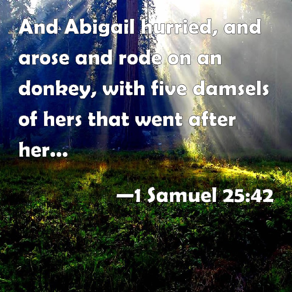 1 Samuel 25:42 And Abigail hurried, and arose and rode on an ass, with five damsels of hers that went after her; and she went after the messengers of David, and became his wife.
