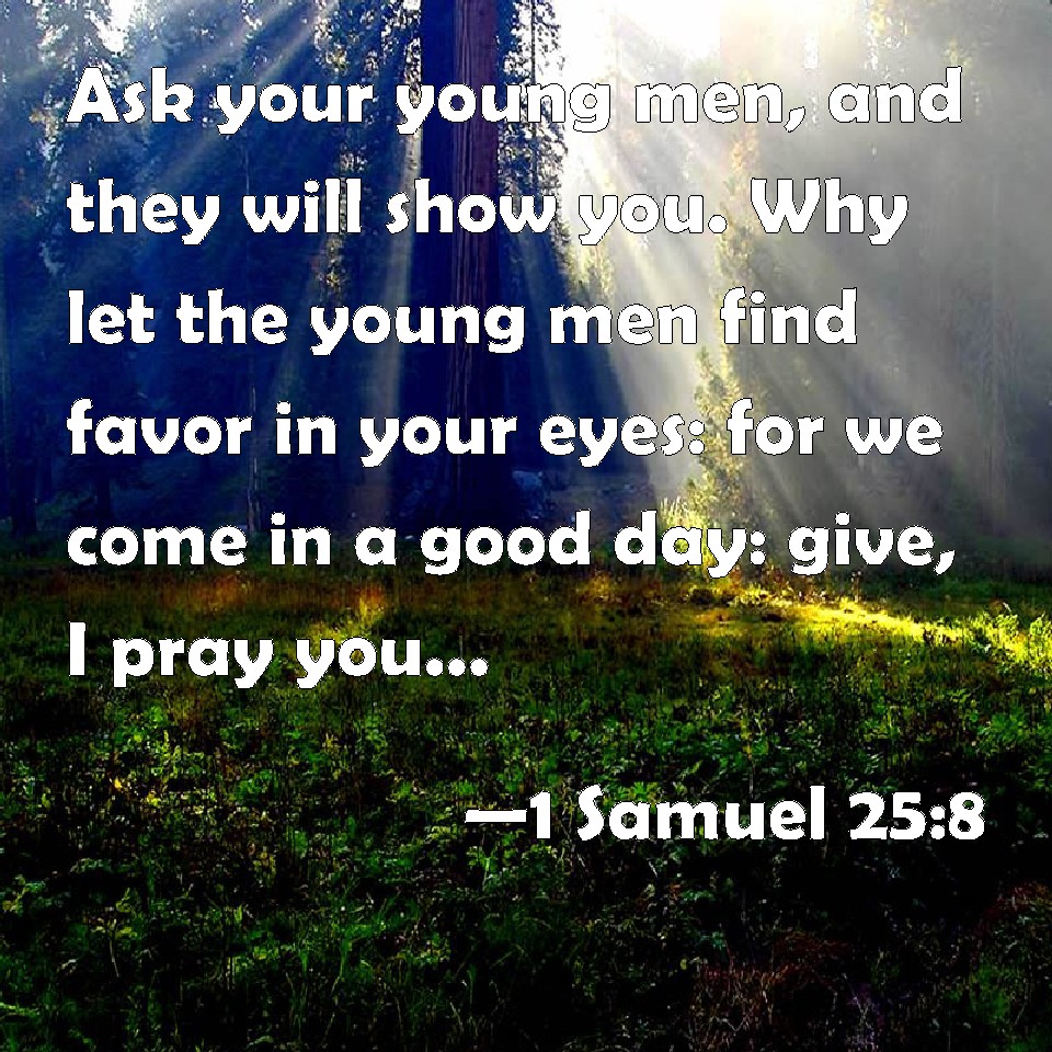 Choose a Background 1 Samuel 25:8 Ask your young men, and they will show you. Why let the young men find favor in your eyes: for we come in a good day: give, I pray you, whatever comes to your hand to your servants, and to your son David. KJV: Ask thy young men, and they will shew thee. Wherefore let the young men find favour in thine eyes: for we come in a good day: give, I pray thee, whatsoever cometh to thine hand unto thy servants, and to thy son David. DRB: Ask thy servants, and they will tell thee. Now therefore let thy servants find favour in thy eyes: for we are come in a good day, whatsoever thy hand shall find give to thy servants, and to thy son David. DBT: Ask thy young men, and they will tell thee. Therefore let the young men find favour in thine eyes; for we come in a good day: give, I pray thee, what thy hand may find to thy servants, and to thy son David. ERV: Ask thy young men, and they will tell thee: wherefore let the young men find favour in thine eyes; for we come in a good day: give, I pray thee, whatsoever cometh to thine hand, unto thy servants, and to thy son David. WBT: Ask thy young men, and they will show thee. Wherefore let the young men find favor in thy eyes: for we come in a good day: give, I pray thee, whatever cometh to thy hand, to thy servants, and to thy son David. WEB: Ask your young men, and they will tell you. Therefore, let the young men find favor in your eyes; for we come in a good day. Please give whatever comes to your hand, to your servants, and to your son David.'" YLT: 'Ask thy young men, and they declare to thee, and the young men find grace in thine eyes, for on a good day we have come; give, I pray thee, that which thy hand findeth, to thy servants, and to thy son, to David.'Links 1 Samuel 25:8 NIV • 1 Samuel 25:8 NLT • 1 Samuel 25:8 ESV • 1 Samuel 25:8 NASB • 1 Samuel 25:8 KJV • 1 Samuel 25:8 Interlinear • 1 Samuel 25:8 Commentaries • 1 Samuel 25:8 Parallel Texts • 1 Samuel 25:8 Bible Apps • 1 Samuel 25:8 Parallel • Bible Hub |