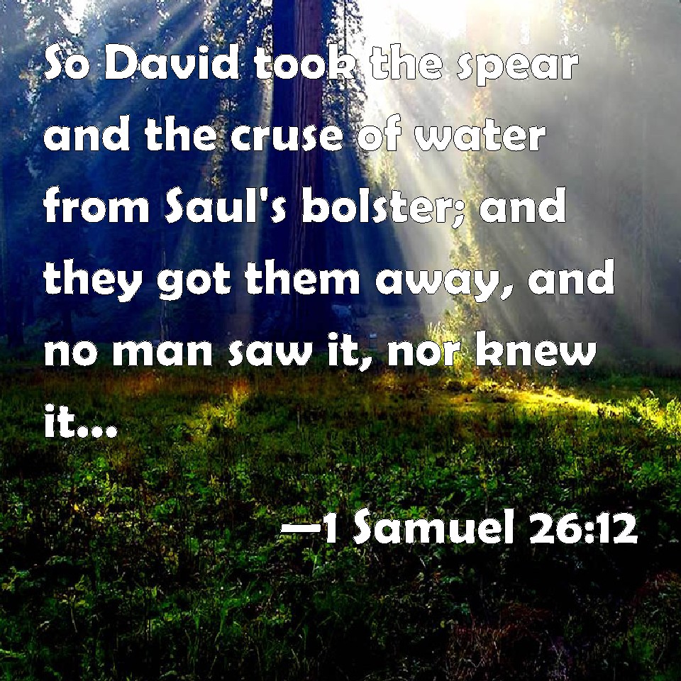 Choose a Background 1 Samuel 26:12 So David took the spear and the cruse of water from Saul's bolster; and they got them away, and no man saw it, nor knew it, neither awaked: for they were all asleep; because a deep sleep from the LORD was fallen on them. KJV: So David took the spear and the cruse of water from Saul's bolster; and they gat them away, and no man saw it, nor knew it, neither awaked: for they were all asleep; because a deep sleep from the LORD was fallen upon them. DRB: So David took the spear, and the cup of water which was at Saul's head, and they went away: and no man saw it, or knew it, or awaked, but they were all asleep, for a deep sleep from the Lord was fallen upon them. DBT: And David took the spear and the cruse of water from Saul's head; and they went away, and no man saw it, and none knew it, and none awaked, for they were all asleep; for a deep sleep from Jehovah had fallen upon them. ERV: So David took the spear and the cruse of water from Saul's head; and they gat them away, and no man saw it, nor knew it, neither did any awake: for they were all asleep; because a deep sleep from the LORD was fallen upon them. WBT: So David took the spear and the cruse of water from Saul's bolster; and they departed, and no man saw it, nor knew it, neither awaked: for they were all asleep: because a deep sleep from the LORD had fallen upon them. WEB: So David took the spear and the jar of water from Saul's head; and they went away: and no man saw it, nor knew it, neither did any awake; for they were all asleep, because a deep sleep from Yahweh was fallen on them. YLT: And David taketh the spear, and the cruse of water at the pillow of Saul, and they go away, and there is none seeing, and there is none knowing, and there is none awaking, for all of them are sleeping, for a deep sleep from Jehovah hath fallen upon them.Links 1 Samuel 26:12 NIV • 1 Samuel 26:12 NLT • 1 Samuel 26:12 ESV • 1 Samuel 26:12 NASB • 1 Samuel 26:12 KJV • 1 Samuel 26:12 Interlinear • 1 Samuel 26:12 Commentaries • 1 Samuel 26:12 Parallel Texts • 1 Samuel 26:12 Bible Apps • 1 Samuel 26:12 Parallel • Bible Hub |
