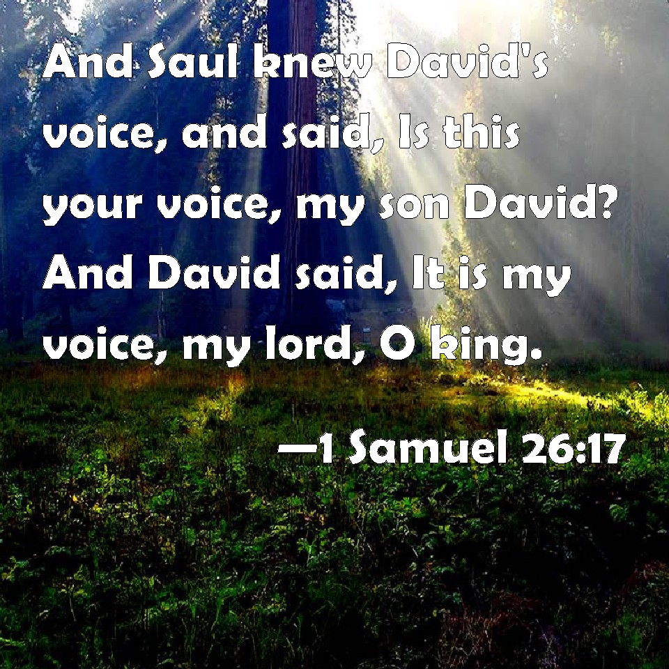 Choose a Background 1 Samuel 26:17 And Saul knew David's voice, and said, Is this your voice, my son David? And David said, It is my voice, my lord, O king. KJV: And Saul knew David's voice, and said, Is this thy voice, my son David? And David said, It is my voice, my lord, O king. DRB: And Saul knew David's voice, and said: Is this thy voice, my son David? And David said: It is my voice, my lord the king. DBT: And Saul knew David's voice, and said, Is this thy voice, my son David? And David said, It is my voice, my lord, O king. ERV: And Saul knew David's voice, and said, Is this thy voice, my son David? And David said, It is my voice, my lord, O king. WBT: And Saul knew David's voice, and said, Is this thy voice, my son David? and David said, It is my voice, my lord, O king. WEB: Saul knew David's voice, and said, "Is this your voice, my son David?" David said, "It is my voice, my lord, O king." YLT: And Saul discerneth the voice of David, and saith, 'Is this thy voice, my son David?' and David saith, 'My voice, my lord, O king!'Links 1 Samuel 26:17 NIV • 1 Samuel 26:17 NLT • 1 Samuel 26:17 ESV • 1 Samuel 26:17 NASB • 1 Samuel 26:17 KJV • 1 Samuel 26:17 Interlinear • 1 Samuel 26:17 Commentaries • 1 Samuel 26:17 Parallel Texts • 1 Samuel 26:17 Bible Apps • 1 Samuel 26:17 Parallel • Bible Hub |