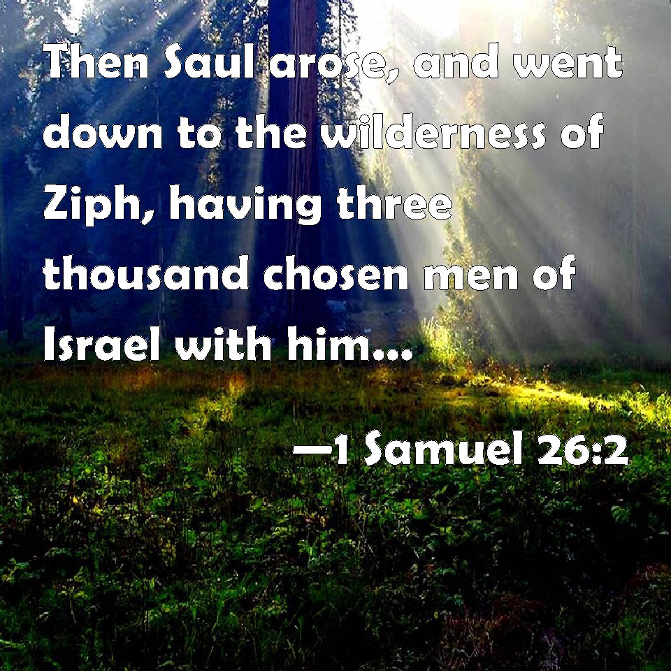 Choose a Background 1 Samuel 26:2 Then Saul arose, and went down to the wilderness of Ziph, having three thousand chosen men of Israel with him, to seek David in the wilderness of Ziph. KJV: Then Saul arose, and went down to the wilderness of Ziph, having three thousand chosen men of Israel with him, to seek David in the wilderness of Ziph. DRB: And Saul arose, and went down to the wilderness of Ziph, having with him three thousand chosen men of Israel, to seek David in the wilderness of Ziph. DBT: And Saul arose, and went down to the wilderness of Ziph, having three thousand chosen men of Israel with him, to seek David in the wilderness of Ziph. ERV: Then Saul arose, and went down to the wilderness of Ziph, having three thousand chosen men of Israel with him, to seek David in the wilderness of Ziph. WBT: Then Saul arose, and went down to the wilderness of Ziph, having three thousand chosen men of Israel with him, to seek David in the wilderness of Ziph. WEB: Then Saul arose, and went down to the wilderness of Ziph, having three thousand chosen men of Israel with him, to seek David in the wilderness of Ziph. YLT: And Saul riseth, and goeth down unto the wilderness of Ziph, and with him three thousand men, chosen ones of Israel, to seek David in the wilderness of Ziph.Links 1 Samuel 26:2 NIV • 1 Samuel 26:2 NLT • 1 Samuel 26:2 ESV • 1 Samuel 26:2 NASB • 1 Samuel 26:2 KJV • 1 Samuel 26:2 Interlinear • 1 Samuel 26:2 Commentaries • 1 Samuel 26:2 Parallel Texts • 1 Samuel 26:2 Bible Apps • 1 Samuel 26:2 Parallel • Bible Hub |