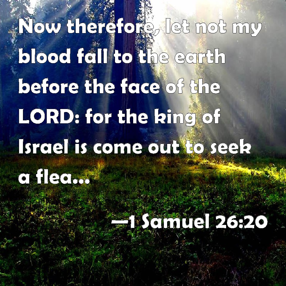 Choose a Background 1 Samuel 26:20 Now therefore, let not my blood fall to the earth before the face of the LORD: for the king of Israel is come out to seek a flea, as when one does hunt a partridge in the mountains. KJV: Now therefore, let not my blood fall to the earth before the face of the LORD: for the king of Israel is come out to seek a flea, as when one doth hunt a partridge in the mountains. DRB: And now let not my blood be shed upon the earth before the Lord: for the king of Israel is come out to seek a flea, as the partridge is hunted in the mountains. DBT: And now, let not my blood fall to the earth far from the face of Jehovah; for the king of Israel is come out to seek a single flea, as when they hunt a partridge on the mountains. ERV: Now therefore, let not my blood fall to the earth away from the presence of the LORD: for the king of Israel is come out to seek a flea, as when one doth hunt a partridge in the mountains. WBT: Now therefore, let not my blood fall to the earth before the face of the LORD: for the king of Israel hath come out to seek a flea, as when one doth hunt a partridge in the mountains. WEB: Now therefore, don't let my blood fall to the earth away from the presence of Yahweh; for the king of Israel has come out to seek a flea, as when one hunts a partridge in the mountains." YLT: And now, let not my blood fall to the earth over-against the face of Jehovah, for the king of Israel hath come out to seek one flea, as one pursueth the partridge in mountains.'Links 1 Samuel 26:20 NIV • 1 Samuel 26:20 NLT • 1 Samuel 26:20 ESV • 1 Samuel 26:20 NASB • 1 Samuel 26:20 KJV • 1 Samuel 26:20 Interlinear • 1 Samuel 26:20 Commentaries • 1 Samuel 26:20 Parallel Texts • 1 Samuel 26:20 Bible Apps • 1 Samuel 26:20 Parallel • Bible Hub |