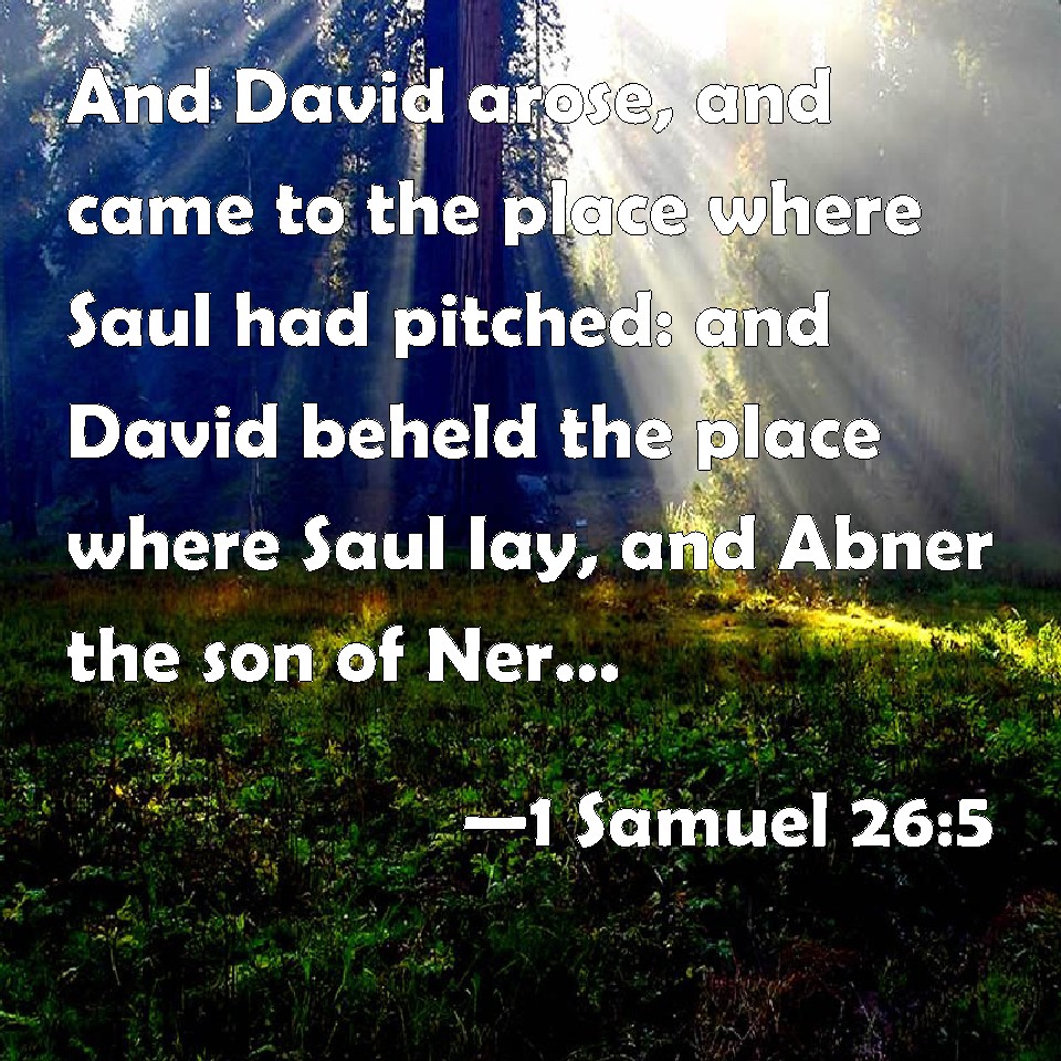 Choose a Background 1 Samuel 26:5 And David arose, and came to the place where Saul had pitched: and David beheld the place where Saul lay, and Abner the son of Ner, the captain of his host: and Saul lay in the trench, and the people pitched round about him. KJV: And David arose, and came to the place where Saul had pitched: and David beheld the place where Saul lay, and Abner the son of Ner, the captain of his host: and Saul lay in the trench, and the people pitched round about him. DRB: And David arose secretly, and came to the place where Saul was: and when he had beheld the place, wherein Saul slept, and Abner the son of Ner, the captain of his army, and Saul sleeping in a tent, and the rest of the multitude round about him, DBT: And David arose and came to the place where Saul had encamped; and David beheld the place where Saul lay, and Abner the son of Ner, the captain of his host; and Saul lay within the wagon-defence, and the people were encamped round about him. ERV: And David arose, and came to the place where Saul had pitched: and David beheld the place where Saul lay, and Abner the son of Ner, the captain of his host: and Saul lay within the place of the wagons, and the people pitched round about him. WBT: And David arose, and came to the place where Saul had encamped; and David beheld the place where Saul lay, and Abner, the son of Ner, the captain of his host: and Saul lay in the trench, and the people pitched around him. WEB: David arose, and came to the place where Saul had encamped; and David saw the place where Saul lay, and Abner the son of Ner, the captain of his army: and Saul lay within the place of the wagons, and the people were encamped around him. YLT: and David riseth, and cometh in unto the place where Saul hath encamped, and David seeth the place where Saul hath lain, and Abner son of Ner, head of his host, and Saul is lying in the path, and the people are encamping round about him.Links 1 Samuel 26:5 NIV • 1 Samuel 26:5 NLT • 1 Samuel 26:5 ESV • 1 Samuel 26:5 NASB • 1 Samuel 26:5 KJV • 1 Samuel 26:5 Interlinear • 1 Samuel 26:5 Commentaries • 1 Samuel 26:5 Parallel Texts • 1 Samuel 26:5 Bible Apps • 1 Samuel 26:5 Parallel • Bible Hub |
