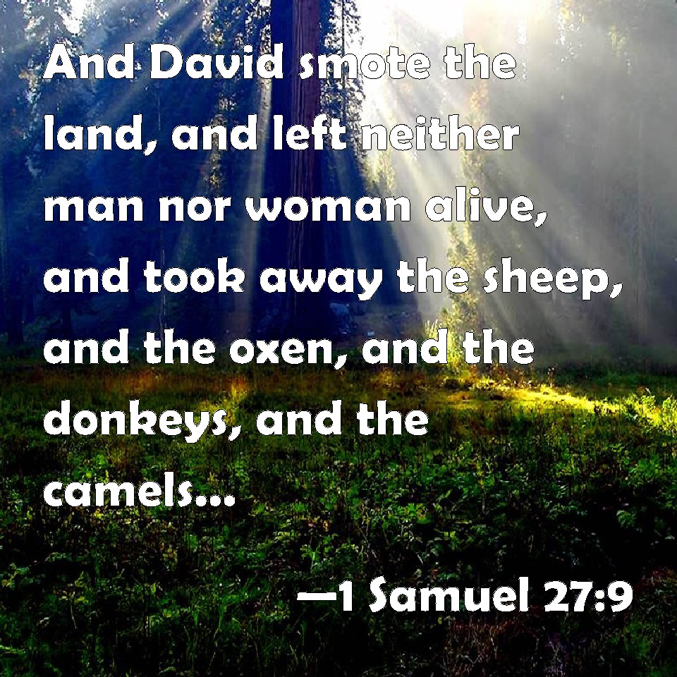 Choose a Background 1 Samuel 27:9 And David smote the land, and left neither man nor woman alive, and took away the sheep, and the oxen, and the asses, and the camels, and the apparel, and returned, and came to Achish. KJV: And David smote the land, and left neither man nor woman alive, and took away the sheep, and the oxen, and the asses, and the camels, and the apparel, and returned, and came to Achish. DRB: And David wasted all the land, and left neither man nor woman alive: and took away the sheep and the oxen, and the asses, and the camels, and the apparel, and returned and came to Achis. DBT: And David smote the land, and left neither man nor woman alive, and took away the sheep, and the oxen, and the asses, and the camels, and the apparel, and returned, and came to Achish. ERV: And David smote the land, and saved neither man nor woman alive, and took away the sheep, and the oxen, and the asses, and the camels, and the apparel; and he returned, and came to Achish. WBT: And David smote the land, and left neither man nor woman alive, and took away the sheep, and the oxen, and the asses, and the camels, and the apparel, and returned, and came to Achish. WEB: David struck the land, and saved neither man nor woman alive, and took away the sheep, and the cattle, and the donkeys, and the camels, and the clothing; and he returned, and came to Achish. YLT: and David hath smitten the land, and doth not keep alive man and woman, and hath taken sheep, and oxen, and asses, and camels, and garments, and turneth back, and cometh in unto Achish.Links 1 Samuel 27:9 NIV • 1 Samuel 27:9 NLT • 1 Samuel 27:9 ESV • 1 Samuel 27:9 NASB • 1 Samuel 27:9 KJV • 1 Samuel 27:9 Interlinear • 1 Samuel 27:9 Commentaries • 1 Samuel 27:9 Parallel Texts • 1 Samuel 27:9 Bible Apps • 1 Samuel 27:9 Parallel • Bible Hub |