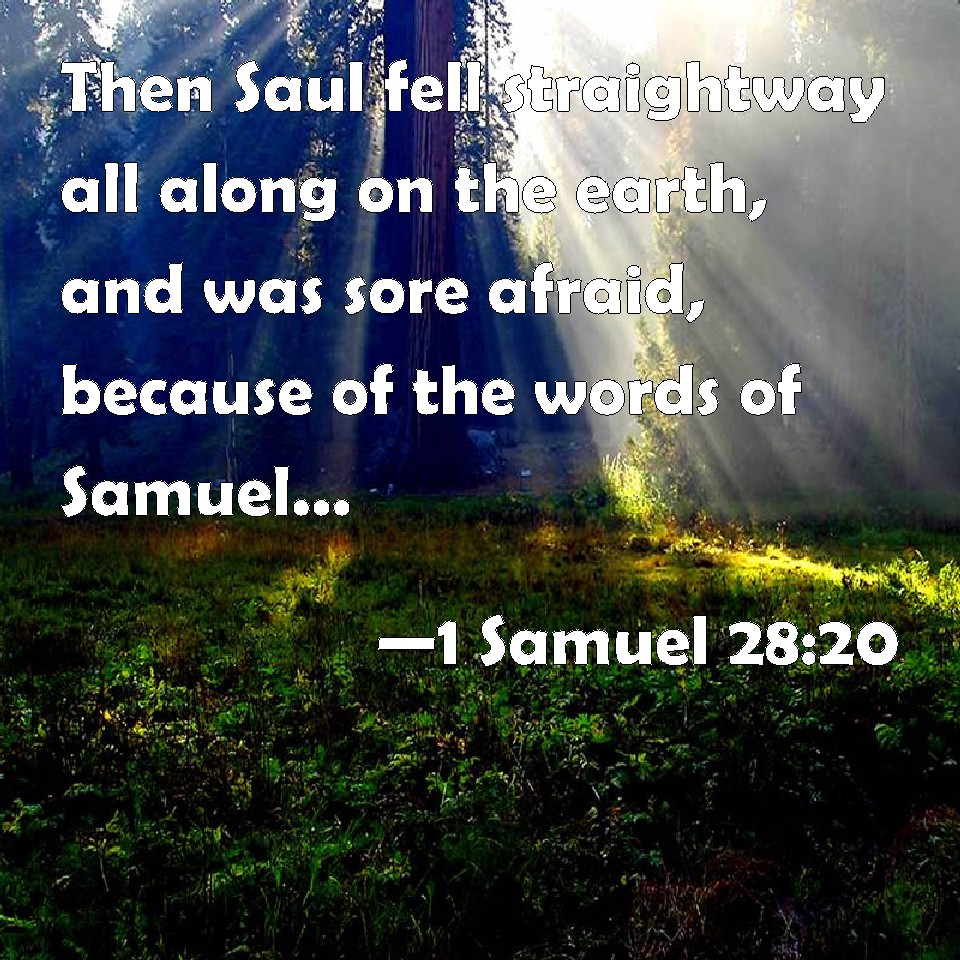 Choose a Background 1 Samuel 28:20 Then Saul fell straightway all along on the earth, and was sore afraid, because of the words of Samuel: and there was no strength in him; for he had eaten no bread all the day, nor all the night. KJV: Then Saul fell straightway all along on the earth, and was sore afraid, because of the words of Samuel: and there was no strength in him; for he had eaten no bread all the day, nor all the night. DRB: And forthwith Saul fell all along on the ground, for he was frightened with the words of Samuel, and there was no strength in him, for he had eaten no bread all that day. DBT: And Saul fell straightway his full length on the earth, and was sore afraid because of the words of Samuel; and there was no strength in him, for he had eaten no bread all the day nor all the night. ERV: Then Saul fell straightway his full length upon the earth, and was sore afraid, because of the words of Samuel: and there was no strength in him; for he had eaten no bread all the day, nor all the night. WBT: Then Saul fell immediately all along on the earth, and was exceedingly afraid, because of the words of Samuel: and there was no strength in him; for he had eaten no bread all the day, nor all the night. WEB: Then Saul fell immediately his full length on the earth, and was terrified, because of the words of Samuel. There was no strength in him; for he had eaten no bread all the day, nor all the night. YLT: And Saul hasteth and falleth — the fulness of his stature — to the earth, and feareth greatly because of the words of Samuel; also power was not in him, for he had not eaten bread all the day, and all the night.Links 1 Samuel 28:20 NIV • 1 Samuel 28:20 NLT • 1 Samuel 28:20 ESV • 1 Samuel 28:20 NASB • 1 Samuel 28:20 KJV • 1 Samuel 28:20 Interlinear • 1 Samuel 28:20 Commentaries • 1 Samuel 28:20 Parallel Texts • 1 Samuel 28:20 Bible Apps • 1 Samuel 28:20 Parallel • Bible Hub |