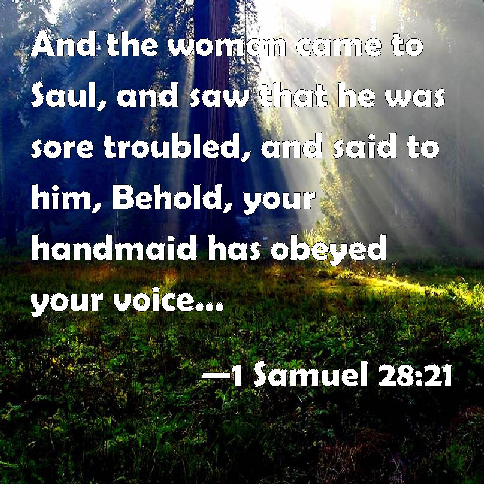 Choose a Background 1 Samuel 28:21 And the woman came to Saul, and saw that he was sore troubled, and said to him, Behold, your handmaid has obeyed your voice, and I have put my life in my hand, and have listened to your words which you spoke to me. KJV: And the woman came unto Saul, and saw that he was sore troubled, and said unto him, Behold, thine handmaid hath obeyed thy voice, and I have put my life in my hand, and have hearkened unto thy words which thou spakest unto me. DRB: And the woman came to Saul (for he was very much troubled) and said to him: Behold thy handmaid hath obeyed thy voice, and I have put my life in my hand: and I hearkened unto the words which thou spokest to me. DBT: And the woman came to Saul, and saw that he was sore troubled, and said to him, Behold, thy bondmaid has hearkened to thy voice, and I have put my life in my hand, and have hearkened to thy words which thou spokest to me. ERV: And the woman came unto Saul, and saw that he was sore troubled, and said unto him, Behold, thine handmaid hath hearkened unto thy voice, and I have put my life in my hand, and have hearkened unto thy words which thou spakest unto me. WBT: And the woman came to Saul, and saw that he was greatly troubled, and said to him, Behold, thy handmaid hath obeyed thy voice, and I have put my life in my hand, and have hearkened to thy words, which thou didst speak WEB: The woman came to Saul, and saw that he was very troubled, and said to him, "Behold, your handmaid has listened to your voice, and I have put my life in my hand, and have listened to your words which you spoke to me. YLT: And the woman cometh in unto Saul, and seeth that he hath been greatly troubled, and saith unto him, 'Lo, thy maid-servant hath hearkened to thy voice, and I put my soul in my hand, and I obey thy words which thou hast spoken unto me;Links 1 Samuel 28:21 NIV • 1 Samuel 28:21 NLT • 1 Samuel 28:21 ESV • 1 Samuel 28:21 NASB • 1 Samuel 28:21 KJV • 1 Samuel 28:21 Interlinear • 1 Samuel 28:21 Commentaries • 1 Samuel 28:21 Parallel Texts • 1 Samuel 28:21 Bible Apps • 1 Samuel 28:21 Parallel • Bible Hub |