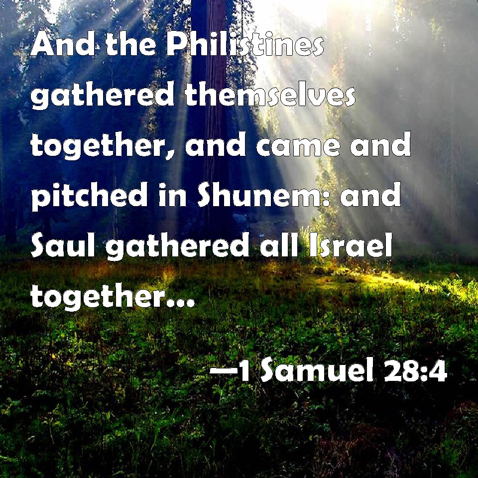 Choose a Background 1 Samuel 28:4 And the Philistines gathered themselves together, and came and pitched in Shunem: and Saul gathered all Israel together, and they pitched in Gilboa. KJV: And the Philistines gathered themselves together, and came and pitched in Shunem: and Saul gathered all Israel together, and they pitched in Gilboa. DRB: And the Philistines were gathered together, and came and camped in Sunam: and Saul also gathered together all Israel, and came to Gelboe. DBT: And the Philistines gathered themselves together, and came and encamped in Shunem; and Saul gathered all Israel together, and they encamped in Gilboa. ERV: And the Philistines gathered themselves together, and came and pitched in Shunem: and Saul gathered all Israel together, and they pitched in Gilboa. WBT: And the Philistines assembled, and came and encamped in Shunem: and Saul collected all Israel, and they encamped in Gilboa. WEB: The Philistines gathered themselves together, and came and encamped in Shunem: and Saul gathered all Israel together, and they encamped in Gilboa. YLT: And the Philistines are gathered, and come in, and encamp in Shunem, and Saul gathereth all Israel, and they encamp in Gilboa,Links 1 Samuel 28:4 NIV • 1 Samuel 28:4 NLT • 1 Samuel 28:4 ESV • 1 Samuel 28:4 NASB • 1 Samuel 28:4 KJV • 1 Samuel 28:4 Interlinear • 1 Samuel 28:4 Commentaries • 1 Samuel 28:4 Parallel Texts • 1 Samuel 28:4 Bible Apps • 1 Samuel 28:4 Parallel • Bible Hub |