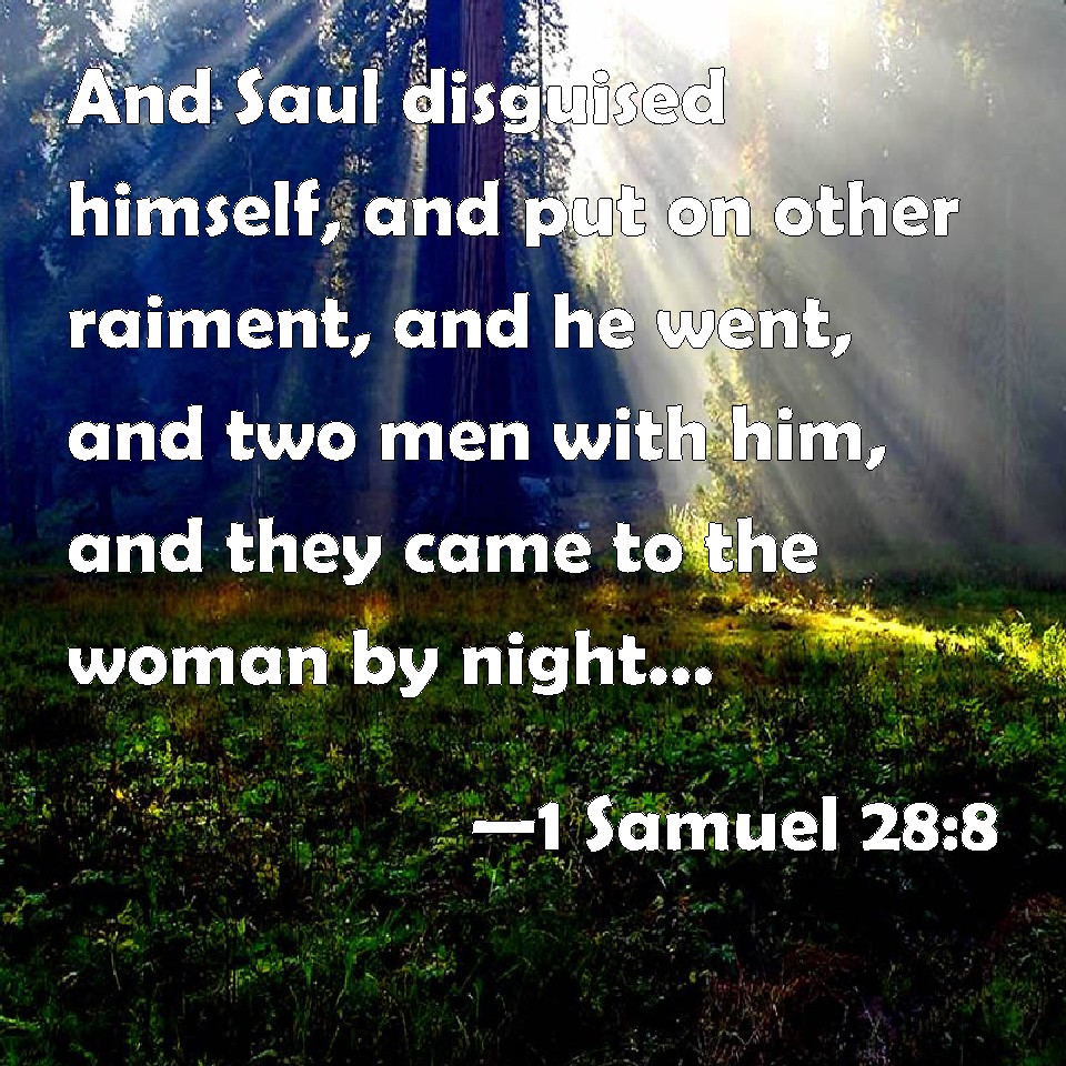 Choose a Background 1 Samuel 28:8 And Saul disguised himself, and put on other raiment, and he went, and two men with him, and they came to the woman by night: and he said, I pray you, divine to me by the familiar spirit, and bring me him up, whom I shall name to you. KJV: And Saul disguised himself, and put on other raiment, and he went, and two men with him, and they came to the woman by night: and he said, I pray thee, divine unto me by the familiar spirit, and bring me him up, whom I shall name unto thee. DRB: Then he disguised himself: and put on other clothes, and he went, and two men with him, and they came to the woman by night, and he said to her: Divine to me by thy divining spirit, and bring me up him whom I shall tell thee. DBT: And Saul disguised himself, and put on other garments, and he went, and two men with him, and they came to the woman by night; and he said, I pray thee, divine to me by the spirit of Python, and bring me him up whom I shall name to thee. ERV: And Saul disguised himself, and put on other raiment, and went, he and two men with him, and they came to the woman by night: and he said, Divine unto me, I pray thee, by the familiar spirit, and bring me up whomsoever I shall name unto thee. WBT: And Saul disguised himself, and put on other raiment, and he went, and two men with him, and they came to the woman by night: and he said, I pray thee, divine to me by the familiar spirit, and bring up for me whom I shall name to thee. WEB: Saul disguised himself, and put on other clothing, and went, he and two men with him, and they came to the woman by night: and he said, "Please divine to me by the familiar spirit, and bring me up whoever I shall name to you." YLT: And Saul disguiseth himself and putteth on other garments, and goeth, he and two of the men with him, and they come in unto the woman by night, and he saith, 'Divine, I pray thee, to me by the familiar spirit, and cause to come up to me him whom I say unto thee.'Links 1 Samuel 28:8 NIV • 1 Samuel 28:8 NLT • 1 Samuel 28:8 ESV • 1 Samuel 28:8 NASB • 1 Samuel 28:8 KJV • 1 Samuel 28:8 Interlinear • 1 Samuel 28:8 Commentaries • 1 Samuel 28:8 Parallel Texts • 1 Samuel 28:8 Bible Apps • 1 Samuel 28:8 Parallel • Bible Hub |