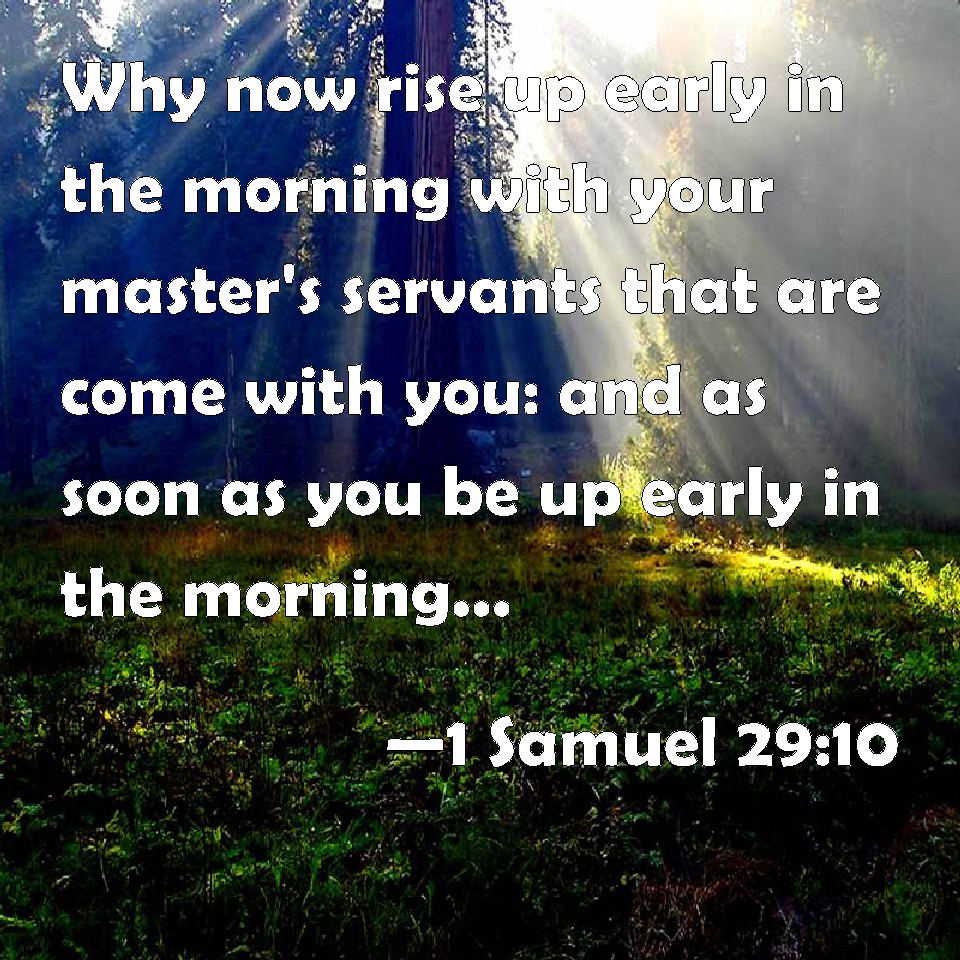 Choose a Background 1 Samuel 29:10 Why now rise up early in the morning with your master's servants that are come with you: and as soon as you be up early in the morning, and have light, depart. KJV: Wherefore now rise up early in the morning with thy master's servants that are come with thee: and as soon as ye be up early in the morning, and have light, depart. DRB: Therefore arise in the morning, thou, and the servants of thy lord, who came with thee: and when you are up before day, and it shall begin to be light, go on your way. DBT: And now rise up early in the morning with thy master's servants that are come with thee; and rise ye early in the morning, and when ye have daylight, depart. ERV: Wherefore now rise up early in the morning with the servants of thy lord that are come with thee: and as soon as ye be up early in the morning, and have light, depart. WBT: Wherefore now rise early in the morning with thy master's servants that are come with thee: and as soon as ye shall have risen early in the morning, and have light, depart. WEB: Therefore now rise up early in the morning with the servants of your lord who have come with you; and as soon as you are up early in the morning, and have light, depart." YLT: and now, rise thou early in the morning, and the servants of thy lord who have come with thee, when ye have risen early in the morning, and have light, then go ye.'Links 1 Samuel 29:10 NIV • 1 Samuel 29:10 NLT • 1 Samuel 29:10 ESV • 1 Samuel 29:10 NASB • 1 Samuel 29:10 KJV • 1 Samuel 29:10 Interlinear • 1 Samuel 29:10 Commentaries • 1 Samuel 29:10 Parallel Texts • 1 Samuel 29:10 Bible Apps • 1 Samuel 29:10 Parallel • Bible Hub |