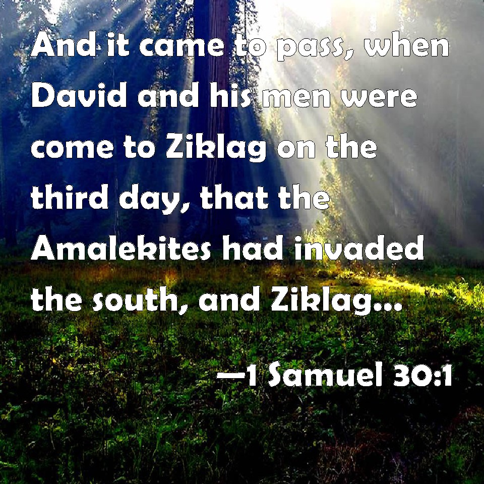 Choose a Background 1 Samuel 30:1 And it came to pass, when David and his men were come to Ziklag on the third day, that the Amalekites had invaded the south, and Ziklag, and smitten Ziklag, and burned it with fire; KJV: And it came to pass, when David and his men were come to Ziklag on the third day, that the Amalekites had invaded the south, and Ziklag, and smitten Ziklag, and burned it with fire; DRB: Now when David and his men were come to Siceleg on the third day, the Amalecites had made an invasion on the south side upon Siceleg, and had smitten Siceleg, and burnt it with fire. DBT: And it came to pass, when David and his men came to Ziklag on the third day, that the Amalekites had made a raid upon the south, and upon Ziklag, and smitten Ziklag and burned it with fire; ERV: And it came to pass, when David and his men were come to Ziklag on the third day, that the Amalekites had made a raid upon the South, and upon Ziklag, and had smitten Ziklag, and burned it with fire; WBT: And it came to pass, when David and his men were come to Ziklag on the third day, that the Amalekites had invaded the south, and Ziklag, and smitten Ziklag, and burned it with fire; WEB: It happened, when David and his men were come to Ziklag on the third day, that the Amalekites had made a raid on the South, and on Ziklag, and had struck Ziklag, and burned it with fire, YLT: And it cometh to pass, in the coming in of David and his men to Ziklag, on the third day, that the Amalekites have pushed unto the south, and unto Ziklag, and smite Ziklag, and burn it with fire,Links 1 Samuel 30:1 NIV • 1 Samuel 30:1 NLT • 1 Samuel 30:1 ESV • 1 Samuel 30:1 NASB • 1 Samuel 30:1 KJV • 1 Samuel 30:1 Interlinear • 1 Samuel 30:1 Commentaries • 1 Samuel 30:1 Parallel Texts • 1 Samuel 30:1 Bible Apps • 1 Samuel 30:1 Parallel • Bible Hub |