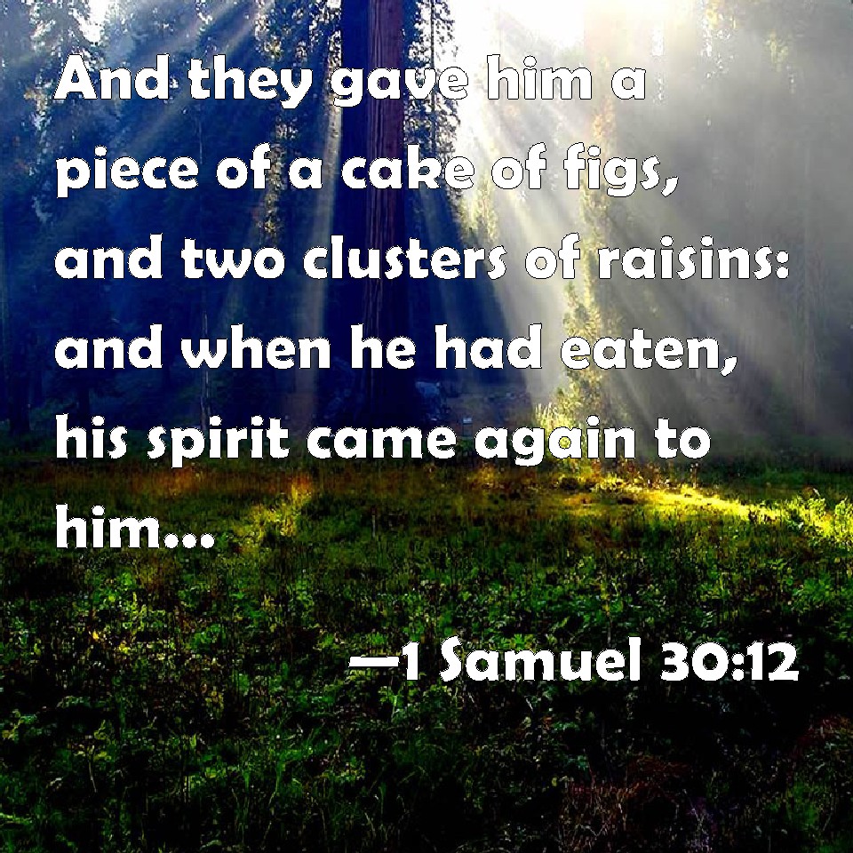 Choose a Background 1 Samuel 30:12 And they gave him a piece of a cake of figs, and two clusters of raisins: and when he had eaten, his spirit came again to him: for he had eaten no bread, nor drunk any water, three days and three nights. KJV: And they gave him a piece of a cake of figs, and two clusters of raisins: and when he had eaten, his spirit came again to him: for he had eaten no bread, nor drunk any water, three days and three nights. DRB: As also a piece of a cake of figs, and two bunches of raisins. And when he had eaten them his spirit returned, and he was refreshed: for he had not eaten bread, nor drunk water three days, and three nights. DBT: and gave him a piece of fig-cake and two raisin-cakes, and he ate, and his spirit came again to him; for he had eaten no bread, nor drunk any water, for three days and three nights. ERV: And they gave him a piece of a cake of figs, and two clusters of raisins; and when he had eaten, his spirit came again to him: for he had eaten no bread, nor drunk any water, three days and three nights. WBT: And they gave him a piece of a cake of figs, and two clusters of raisins: and when he had eaten, his spirit came again to him: for he had eaten no bread, nor drank any water, three days and three nights. WEB: They gave him a piece of a cake of figs, and two clusters of raisins. when he had eaten, his spirit came again to him; for he had eaten no bread, nor drunk any water, three days and three nights. YLT: and give to him a piece of a bunch of dried figs, and two bunches of raisins, and he eateth, and his spirit returneth unto him, for he hath not eaten bread nor drunk water three days and three nights.Links 1 Samuel 30:12 NIV • 1 Samuel 30:12 NLT • 1 Samuel 30:12 ESV • 1 Samuel 30:12 NASB • 1 Samuel 30:12 KJV • 1 Samuel 30:12 Interlinear • 1 Samuel 30:12 Commentaries • 1 Samuel 30:12 Parallel Texts • 1 Samuel 30:12 Bible Apps • 1 Samuel 30:12 Parallel • Bible Hub |