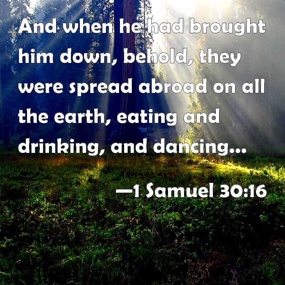 Choose a Background 1 Samuel 30:16 And when he had brought him down, behold, they were spread abroad on all the earth, eating and drinking, and dancing, because of all the great spoil that they had taken out of the land of the Philistines, and out of the land of Judah. KJV: And when he had brought him down, behold, they were spread abroad upon all the earth, eating and drinking, and dancing, because of all the great spoil that they had taken out of the land of the Philistines, and out of the land of Judah. DRB: And when he had brought him, behold they were lying spread upon all the ground, eating and drinking, and as it were keeping a festival day, for all the prey, and the spoils which they had taken out of the land of the Philistines, and out of the land of Juda. DBT: And he brought him down, and behold, they were spread over the whole land, eating and drinking, and dancing, because of all the great spoil that they had taken out of the land of the Philistines, and out of the land of Judah. ERV: And when he had brought him down, behold, they were spread abroad over all the ground, eating and drinking, and feasting, because of all the great spoil that they had taken out of the land of the Philistines, and out of the land of Judah. WBT: And when he had conducted him down, behold, they were spread abroad upon all the earth, eating and drinking, and dancing, because of all the great spoil that they had taken from the land of the Philistines, and from the land of Judah. WEB: When he had brought him down, behold, they were spread around over all the ground, eating, drinking, and dancing, because of all the great spoil that they had taken out of the land of the Philistines, and out of the land of Judah. YLT: And he bringeth him down, and lo, they are spread out over the face of all the earth, eating, and drinking, and feasting, with all the great spoil which they have taken out of the land of the Philistines, and out of the land of Judah.Links 1 Samuel 30:16 NIV • 1 Samuel 30:16 NLT • 1 Samuel 30:16 ESV • 1 Samuel 30:16 NASB • 1 Samuel 30:16 KJV • 1 Samuel 30:16 Interlinear • 1 Samuel 30:16 Commentaries • 1 Samuel 30:16 Parallel Texts • 1 Samuel 30:16 Bible Apps • 1 Samuel 30:16 Parallel • Bible Hub |