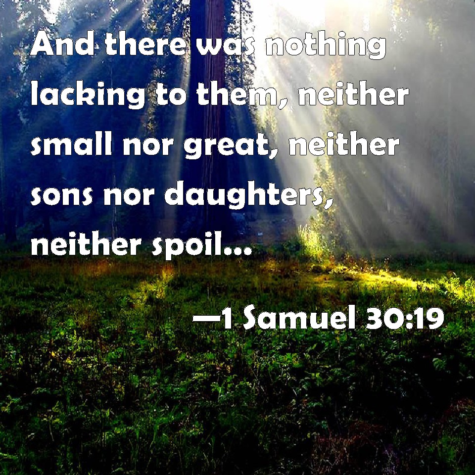 Choose a Background 1 Samuel 30:19 And there was nothing lacking to them, neither small nor great, neither sons nor daughters, neither spoil, nor any thing that they had taken to them: David recovered all. KJV: And there was nothing lacking to them, neither small nor great, neither sons nor daughters, neither spoil, nor any thing that they had taken to them: David recovered all. DRB: And there was nothing missing small or great, neither of their sons or their daughters, nor of the spoils, and whatsoever they had taken: David recovered all. DBT: And there was nothing missed by them, neither small nor great, neither sons nor daughters, neither spoil nor anything that they had taken: David brought all back. ERV: And there was nothing lacking to them, neither small nor great, neither sons nor daughters, neither spoil, nor any thing that they had taken to them: David brought back all. WBT: And there was nothing lacking to them, neither small nor great, neither sons nor daughters, neither spoil, nor any thing that they had taken to them: David recovered all. WEB: There was nothing lacking to them, neither small nor great, neither sons nor daughters, neither spoil, nor anything that they had taken to them. David brought back all. YLT: And there hath not lacked to them anything, from small unto great, and unto sons and daughters, and from the spoil, even unto all that they had taken to themselves, the whole hath David brought back,Links 1 Samuel 30:19 NIV • 1 Samuel 30:19 NLT • 1 Samuel 30:19 ESV • 1 Samuel 30:19 NASB • 1 Samuel 30:19 KJV • 1 Samuel 30:19 Interlinear • 1 Samuel 30:19 Commentaries • 1 Samuel 30:19 Parallel Texts • 1 Samuel 30:19 Bible Apps • 1 Samuel 30:19 Parallel • Bible Hub |