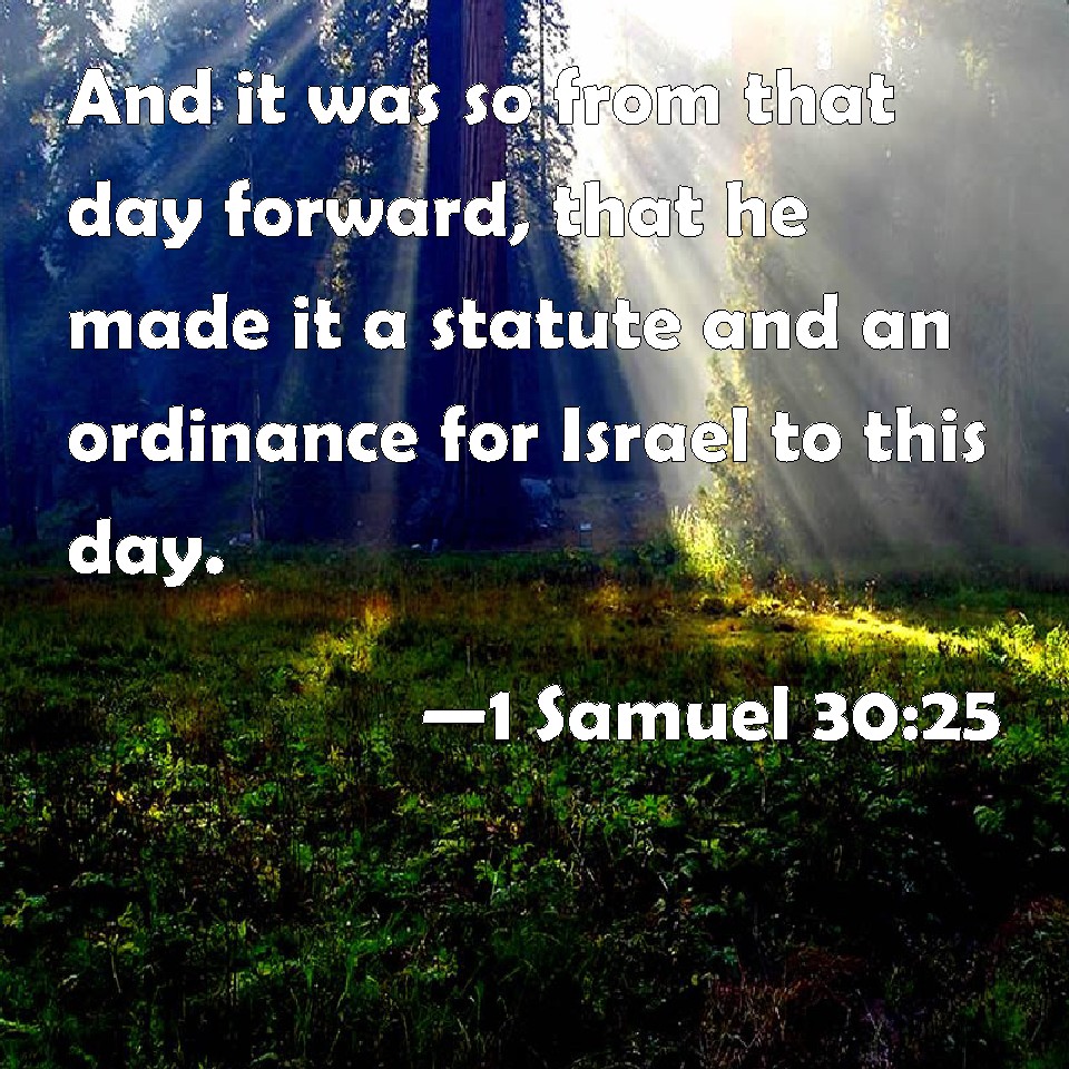 Choose a Background 1 Samuel 30:25 And it was so from that day forward, that he made it a statute and an ordinance for Israel to this day. KJV: And it was so from that day forward, that he made it a statute and an ordinance for Israel unto this day. DRB: And this hath been done from that day forward, and since was made a statute, and an ordinance, and as a law in Israel. DBT: And it was so from that day forward; and he made it a statute and an ordinance for Israel to this day. ERV: And it was so from that day forward, that he made it a statute and an ordinance for Israel, unto this day. WBT: And it was so from that day forward, that he made it a statute and an ordinance for Israel to this day. WEB: It was so from that day forward, that he made it a statute and an ordinance for Israel to this day. YLT: And it cometh to pass from that day and forward, that he appointeth it for a statute and for an ordinance for Israel unto this day.Links 1 Samuel 30:25 NIV • 1 Samuel 30:25 NLT • 1 Samuel 30:25 ESV • 1 Samuel 30:25 NASB • 1 Samuel 30:25 KJV • 1 Samuel 30:25 Interlinear • 1 Samuel 30:25 Commentaries • 1 Samuel 30:25 Parallel Texts • 1 Samuel 30:25 Bible Apps • 1 Samuel 30:25 Parallel • Bible Hub |