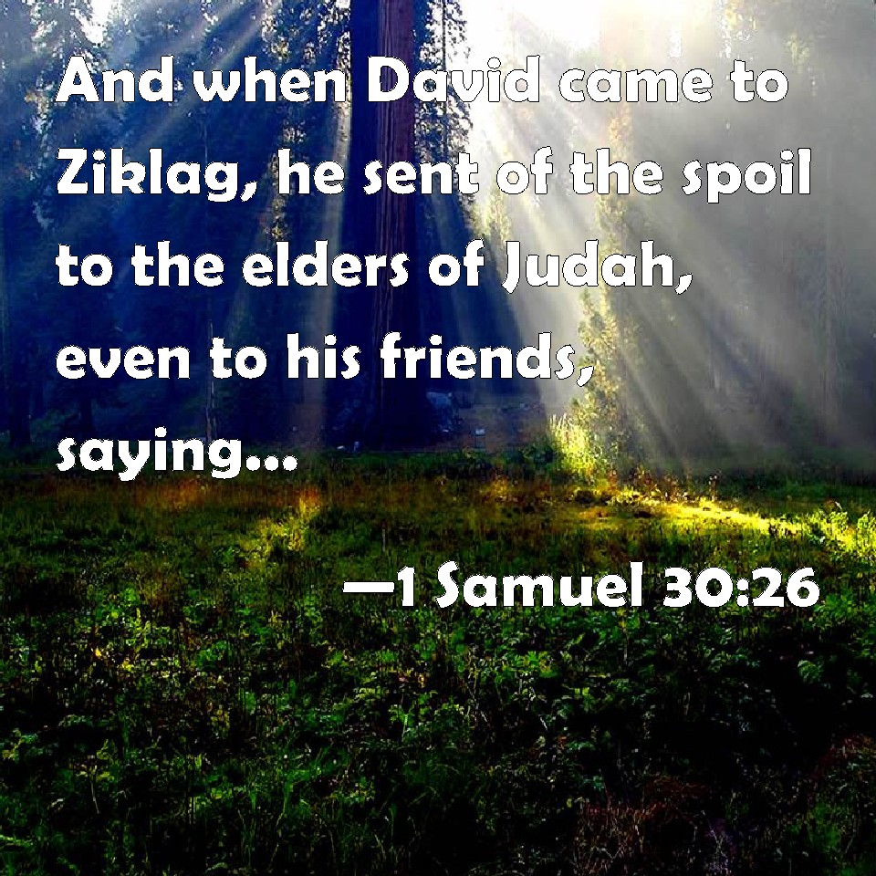 Choose a Background 1 Samuel 30:26 And when David came to Ziklag, he sent of the spoil to the elders of Judah, even to his friends, saying, Behold a present for you of the spoil of the enemies of the LORD; KJV: And when David came to Ziklag, he sent of the spoil unto the elders of Judah, even to his friends, saying, Behold a present for you of the spoil of the enemies of the LORD; DRB: Then David came to Siceleg, and sent presents of the prey to the ancients of Juda his neighbours, saying: Receive a blessing of the prey of the enemies of the Lord. DBT: And David came to Ziklag, and he sent of the spoil to the elders of Judah, to his friends, saying, Behold a present for you of the spoil of the enemies of Jehovah: ERV: And when David came to Ziklag, he sent of the spoil unto the elders of Judah, even to his friends, saying, Behold a present for you of the spoil of the enemies of the LORD; WBT: And when David came to Ziklag, he sent of the spoil to the elders of Judah, even to his friends, saying, Behold a present for you, of the spoil of the enemies of the LORD; WEB: When David came to Ziklag, he sent of the spoil to the elders of Judah, even to his friends, saying, "Behold, a present for you of the spoil of the enemies of Yahweh." YLT: And David cometh in unto Ziklag, and sendeth of the spoil to the elders of Judah, to his friends, (saying, 'Lo, for you a blessing, of the spoil of the enemies of Jehovah),'Links 1 Samuel 30:26 NIV • 1 Samuel 30:26 NLT • 1 Samuel 30:26 ESV • 1 Samuel 30:26 NASB • 1 Samuel 30:26 KJV • 1 Samuel 30:26 Interlinear • 1 Samuel 30:26 Commentaries • 1 Samuel 30:26 Parallel Texts • 1 Samuel 30:26 Bible Apps • 1 Samuel 30:26 Parallel • Bible Hub |