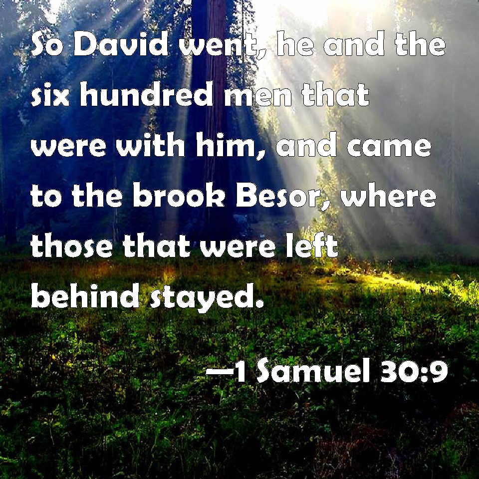Choose a Background 1 Samuel 30:9 So David went, he and the six hundred men that were with him, and came to the brook Besor, where those that were left behind stayed. KJV: So David went, he and the six hundred men that were with him, and came to the brook Besor, where those that were left behind stayed. DRB: So David went, he and the six hundred men that were with him, and they came to the torrent Besor: and some being weary stayed there. DBT: So David went, he and the six hundred men that were with him, and they came to the torrent Besor; and those that were left stayed behind. ERV: So David went, he and the six hundred men that were with him, and came to the brook Besor, where those that were left behind stayed. WBT: So David went, he and the six hundred men that were with him, and came to the brook Besor, where those that were left behind remained. WEB: So David went, he and the six hundred men who were with him, and came to the brook Besor, where those who were left behind stayed. YLT: And David goeth on, he and six hundred men who are with him, and they come in unto the brook of Besor, and those left have stood still,Links 1 Samuel 30:9 NIV • 1 Samuel 30:9 NLT • 1 Samuel 30:9 ESV • 1 Samuel 30:9 NASB • 1 Samuel 30:9 KJV • 1 Samuel 30:9 Interlinear • 1 Samuel 30:9 Commentaries • 1 Samuel 30:9 Parallel Texts • 1 Samuel 30:9 Bible Apps • 1 Samuel 30:9 Parallel • Bible Hub |